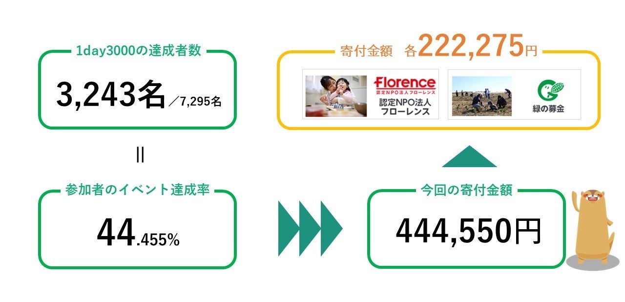 今回、10日間のイベント期間中に毎日3,000歩を達成した参加者は3,243名で、総参加者7,295名に対して44.455%でした。この結果を受け、今回の寄付金額は444,550円となり、8月末日付けで各団体へ222,275円ずつ寄付いたします。なお、イベント後のアンケート結果でもチャリティへの参加は、参加者の半数以上が歩く動機づけになっているという結果となり、ウォーキング以外の取り組みにも高い賛同率が伺えます。