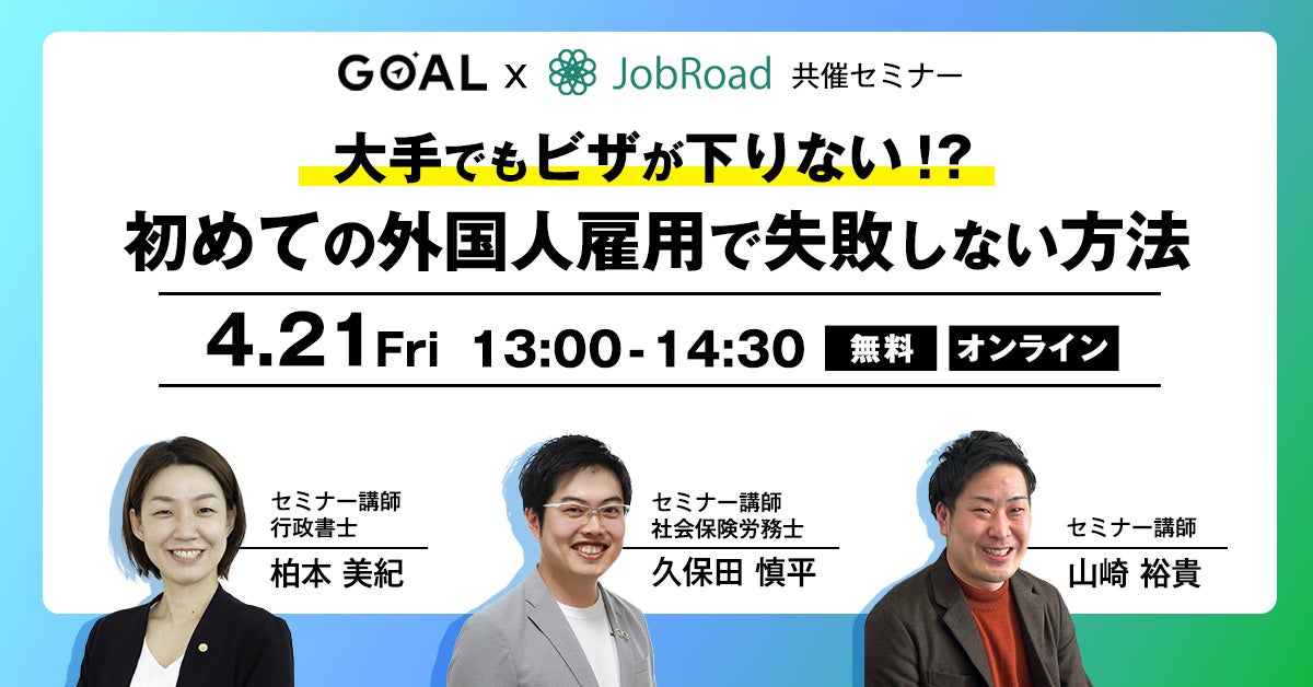 株式会社フルスピードの子会社で、外国人の日本語教育及び就職・転職支援サービス等を展開する株式会社ジョブロードは、行政書士法人「行政書士法人GOAL」の3名をお迎えして、初めて外国人を雇用する方や外国人採用に興味がある方向けのセミナーを4月21日(金)13:00から開催いたします。
