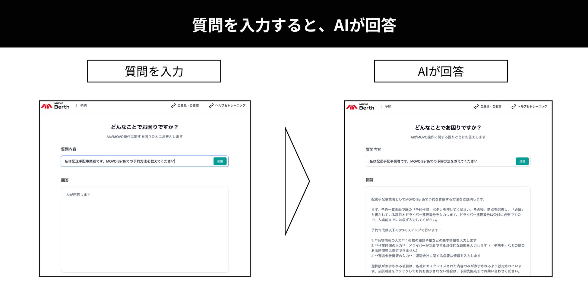 今回新たに提供するAI検索機能は、現時点ではトラック予約受付サービス「MOVO Berth(ムーボ・バース)」で利用可能です。
