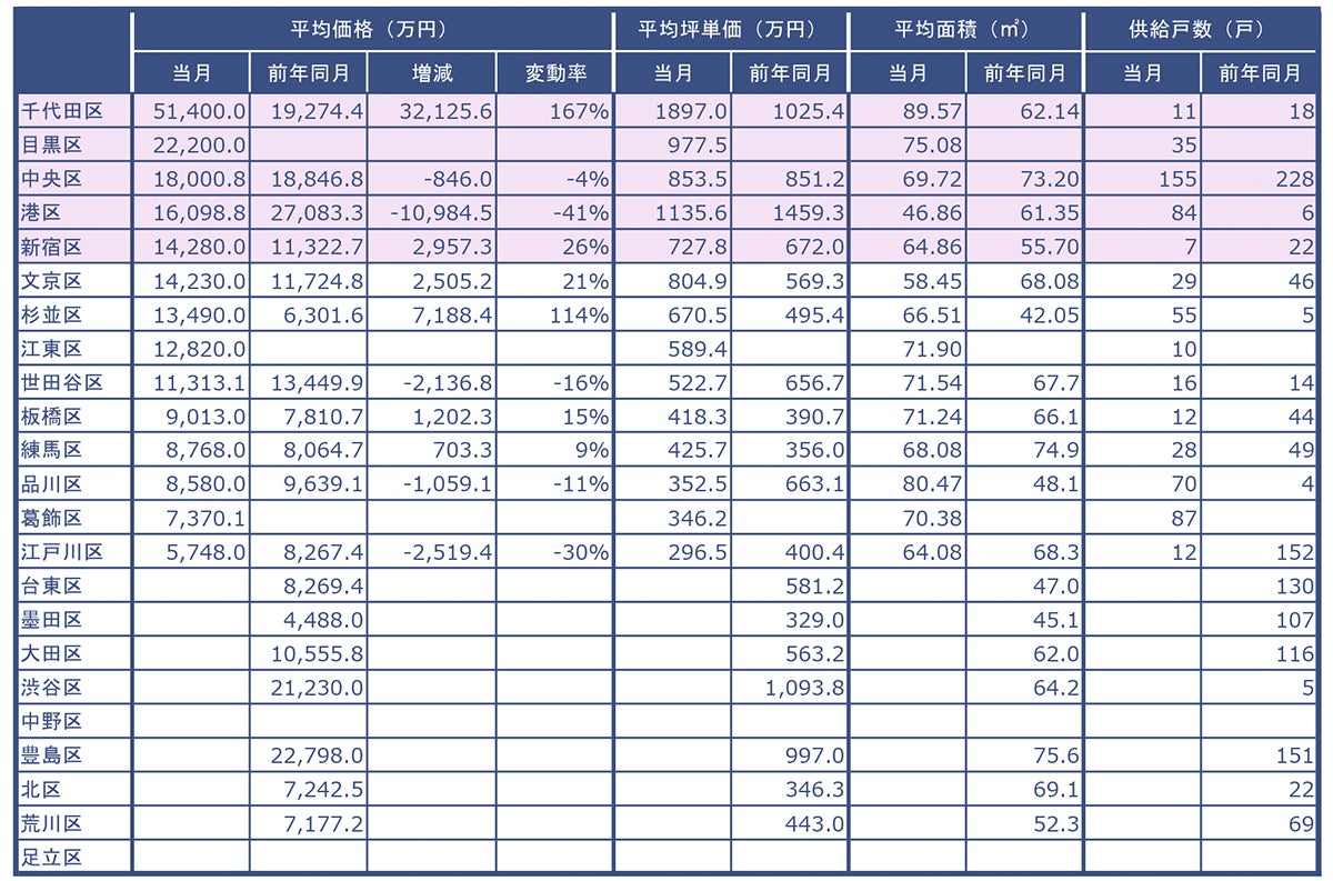 東京23区の各行政区毎に、平均価格、平均坪単価、平均面積、供給戸数をまとめました。当月の平均価格が大きい順に表示しています。