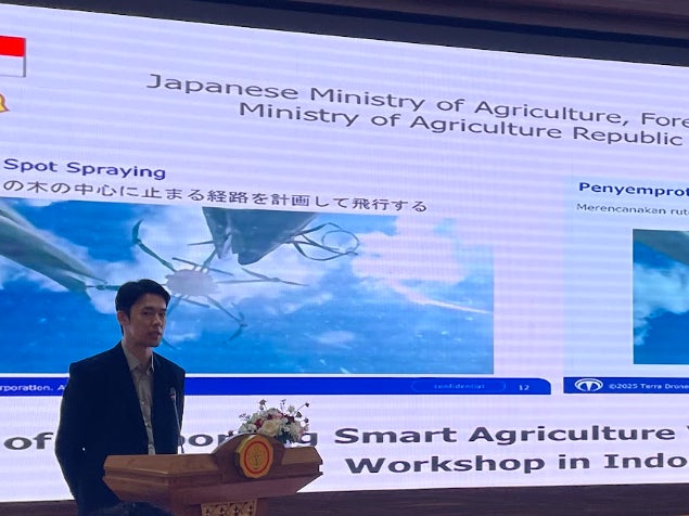 また、本事業の一環として、2025年2月6日にインドネシア・ジャカルタでワークショップが開催されました。ワークショップでは、テラドローン開発執行役員の塩澤駿一が「高精度測位技術を用いたドローンによる農薬・肥料散布」をテーマに登壇しました。