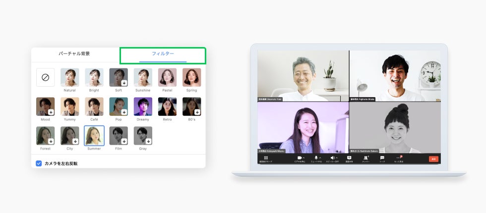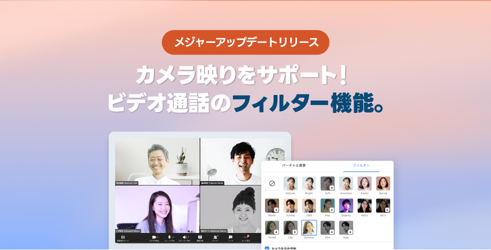 在宅やオフィス以外の場所でオンライン会議を行う場合、部屋の暗さや顔色の映り具合など「映りがいまいちかも」と気になる場合があります。映りが気になってしまい、カメラをONにした状態での会議参加に抵抗感が生まれるケースもあります。今回のメジャーアップデートでは、ビデオ通話中の自分の映像を加工できるフィルター設定が可能になり、映像の色味を調整して表情を明るく見せたり、肌の質感をなめらかに見せることができるようになりました(PC版のみ)。フィルターは計18種類あり、すでに提供しているバーチャル背景機能と合わせて使用することで、より気軽にビデオ通話に参加いただけるようになります。