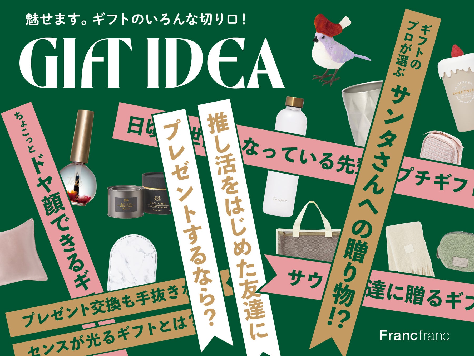 ギフトを贈るシーンが増えるこれからの季節に向け、全17のギフトシーンと、それに対する計55のギフトアイデアを公開します。実用性のあるものから、思わずくすっと笑ってしまうものまで、これまで多くのギフト提案をしてきた全国のFrancfrancスタッフが意見を出し合い決定した、選りすぐりのアイデアをぜひご覧ください。