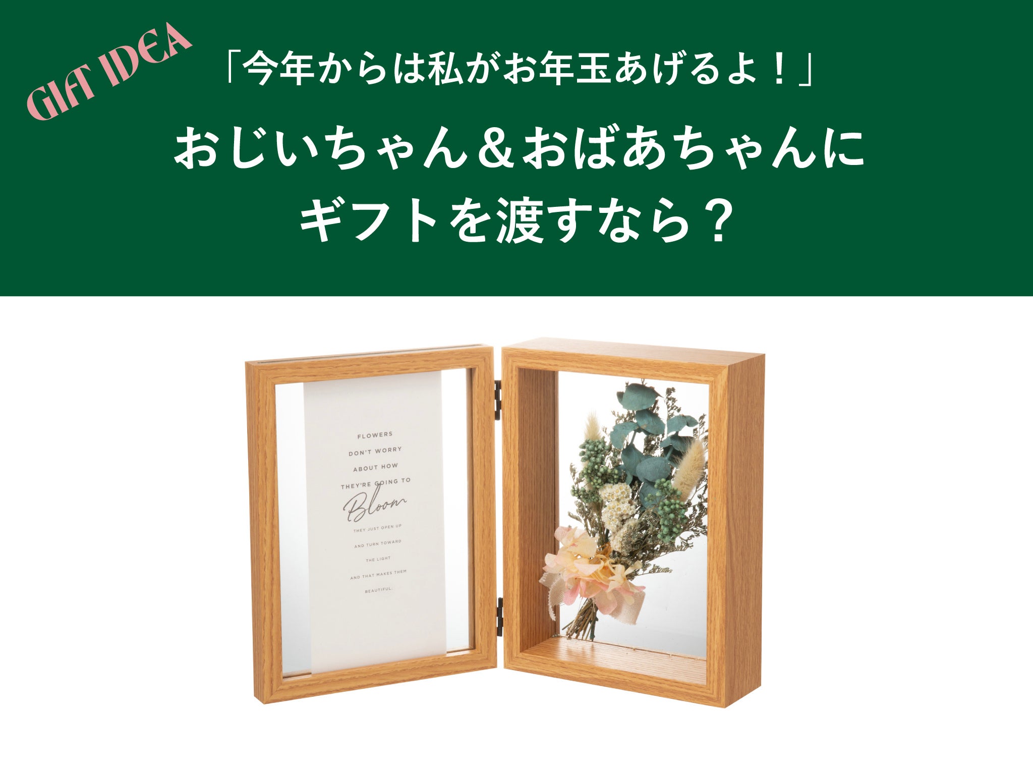ドライフラワーは「永遠に咲き続ける花」として縁起の良いモチーフです。おじいちゃん、おばあちゃんと一緒に撮った写真を飾ってプレゼントしたい!(弘前店)