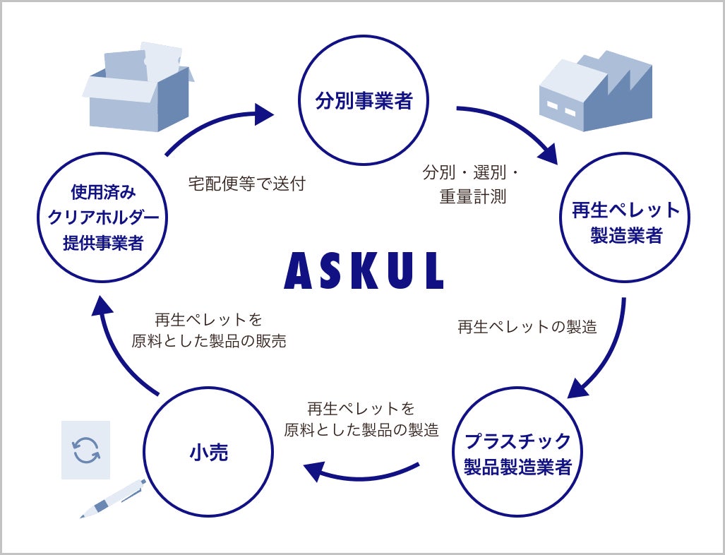 こうした現状を踏まえ、アスクルでは国内でのクリアホルダーの販売シェアが高いことから、販売事業者としての責任という観点でクリアホルダー資源循環に着目しました。クリアホルダーは、単一素材で形状も一定のため、回収・リサイクルに適していると考え、環境省「令和2年度脱炭素社会を支えるプラスチック等資源循環システム構築実証事業」にて、クリアホルダーを対象とした実証事業に挑戦。独自の回収スキームを構築し、回収量および再資源化、製品化を検証の上、実証事業終了後の2022年4月、正式に事業化しました。