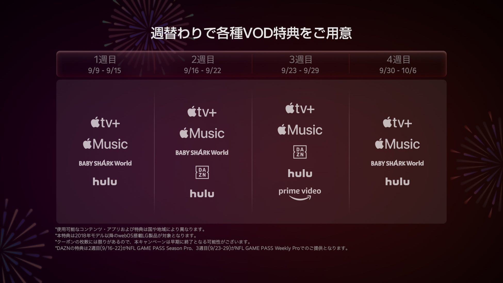 この度のキャンペーンは、webOS 4.0以降の(2018年以降に発売した)LG製テレビをご利用のお客様を対象に、各動画配信サービスをお得にご利用いただける特典を週替わりでご提供します。