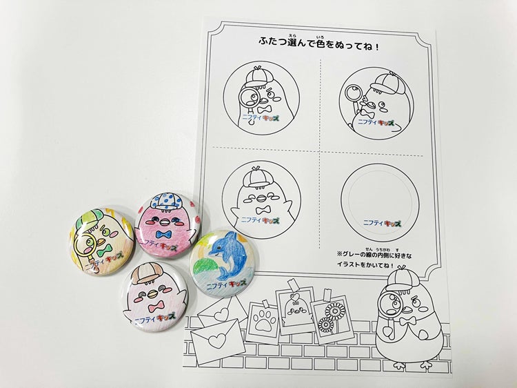 本イベントでは、夏休みの期間に家族で参加していただく場をつくることを目的とし、館内を歩きながら2つの謎を解く「ナゾトキ」、塗り絵やイラストを描いてオリジナルの缶バッジを作成できる「缶バッジ作成ワークショップ」、「ニフティキッズ」のゲームコンテンツの体験コーナーを用意しました。イベントに参加いただいた方を対象に実施した抽選では、その場で撮影した写真が缶バッジとなる賞も用意し、多くの子どもたちや保護者の皆さまに喜んでいただきました。