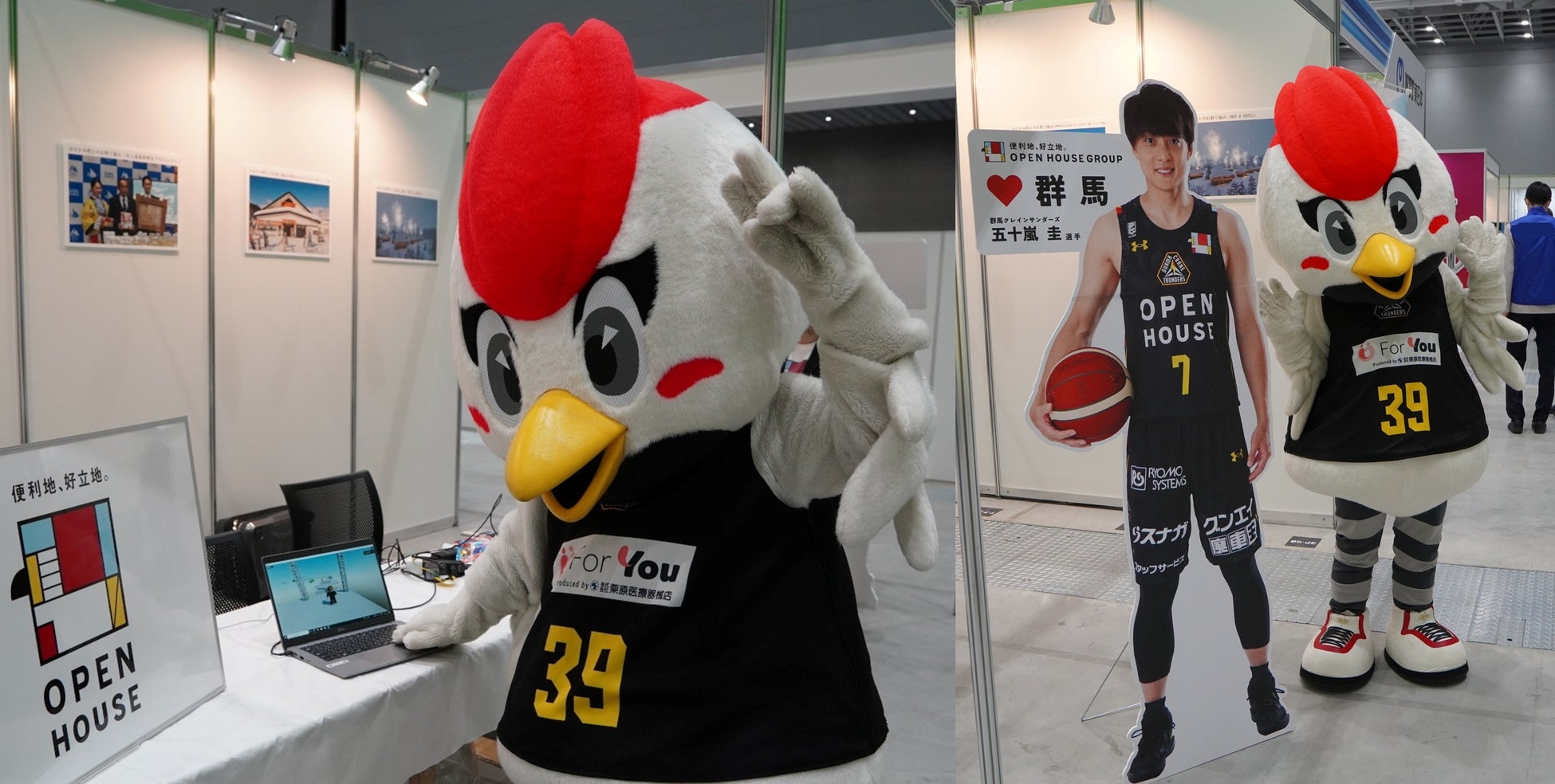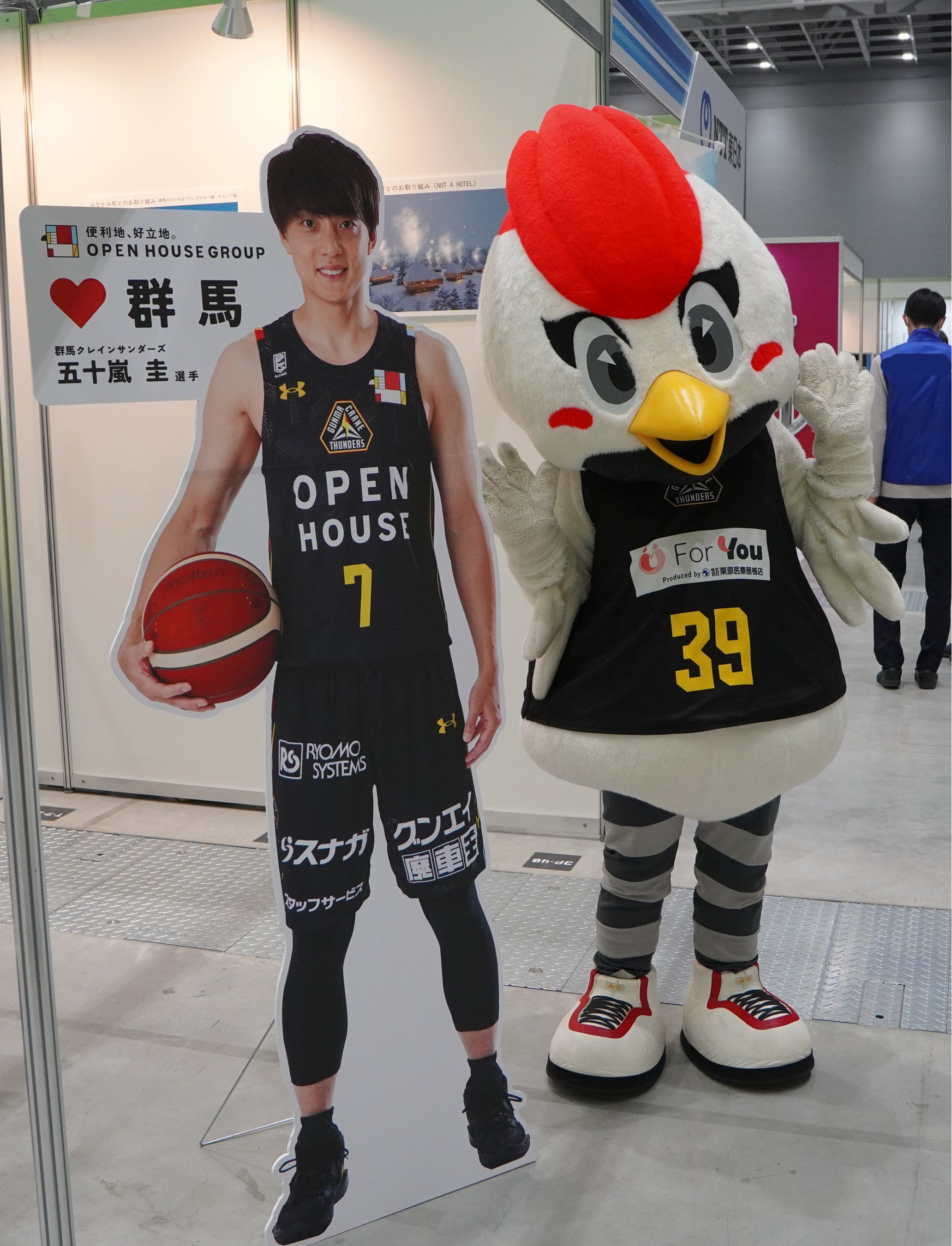 「群馬クレインサンダーズ」を身近に感じていただき応援していただきたいという思いから、会場で試合を盛り上げている、クラブマスコットの「サンダくん」が来場。試合会場と同じように、会場を盛り上げてみなさまを笑顔にするために、自社ブースだけでなく会場全体を張り切ってめぐりました。またブースに設置した「群馬クレインサンダーズ」の五十嵐圭選手の等身大パネルとともに、4月15日に開幕戦を控える「OPEN HOUSE ARENA OTA」通称“オプアリ”の告知を行いました。
