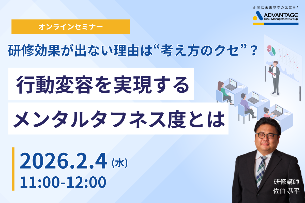 株式会社アドバンテッジリスクマネジメントは、2026年2月4日(水)に、人事・労務部門のご担当者様ならびにメンタルヘルスのご担当者様/責任者様を対象としたWebセミナー「研修効果が出ない理由は“考え方のクセ”? 行動変容を実現するメンタルタフネス度とは」を開催いたします。