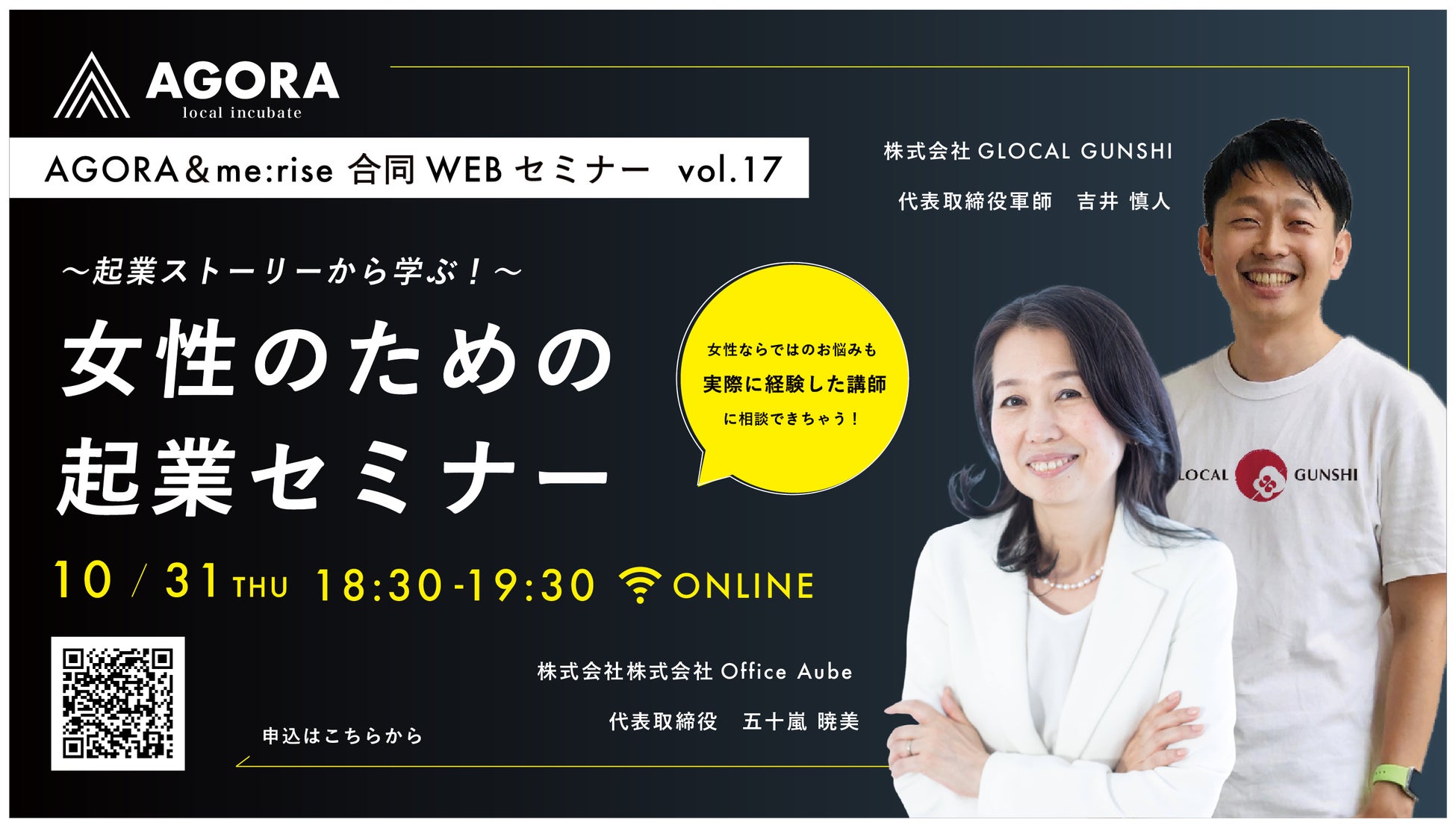 株式会社AGORAでは、2024年10月31日(木)に「女性起業家の成功」をテーマにした創業WEBセミナーを開催します。