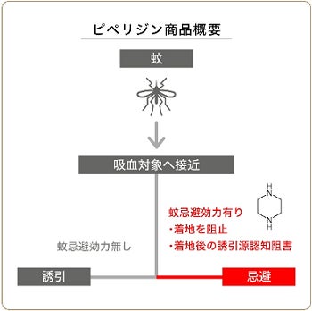 ピぺリジンとはコーヒーや黒胡椒など食品中に存在する成分。虫よけ剤として広く使われている化合物「ディート」よりも3倍以上効果が長持ちし、防虫効果のある成分では安全性が高いと言われています。蚊やその他害虫に対して忌避効力を持ち、「ピペリジン」系化合物は認知能力を混乱させる効力が強いため、蚊や害虫が肌に止まった場合でも吸血されにくくなります。また、マイクロカプセル製剤なので、洗濯にも強く、効果が長持ちします。