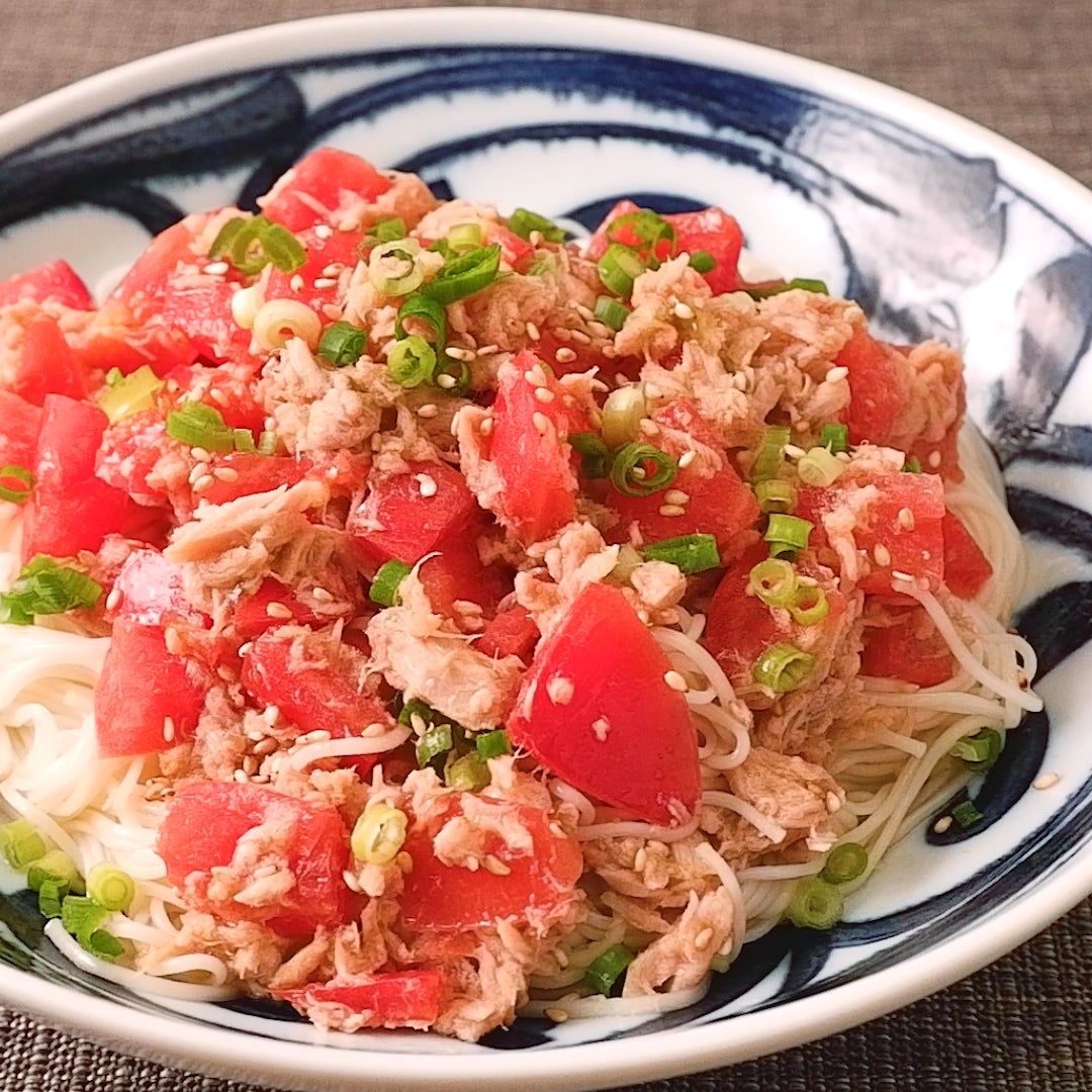 そろそろ、そうめんにも飽きてきた・・・そんな時には、刻んだトマトとツナをトッピングすると美味しいですよ。
