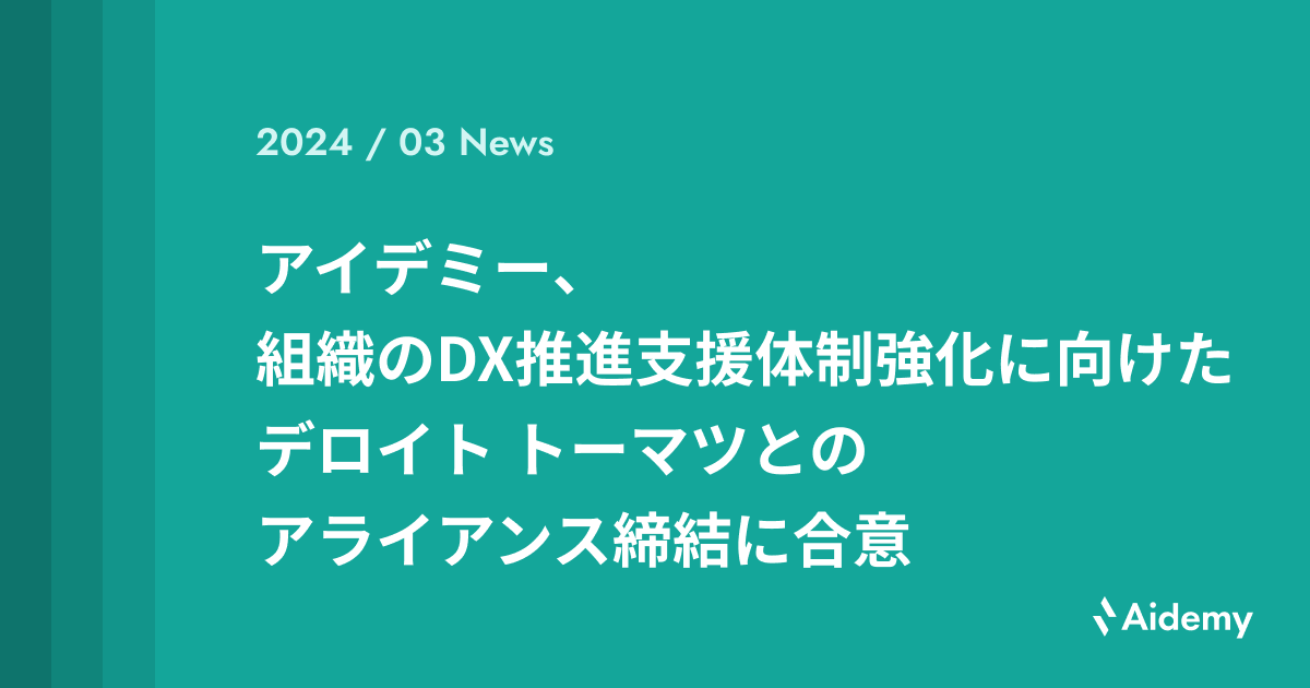 株式会社アイデミー(東京都千代田区、代表取締役 執行役員 社長 石川 聡彦、以下「アイデミー」)は、デロイト トーマツ グループのデロイト トーマツ コンサルティング合同会社(東京都千代田区、代表執行役社長:佐瀬 真人、以下「デロイト トーマツ」)と、デジタル人材育成におけるクライアント課題解決能力の向上及び相互の顧客ネットワークを活用したビジネス展開などを協力して推進していくためのアライアンスに、この度合意しました。