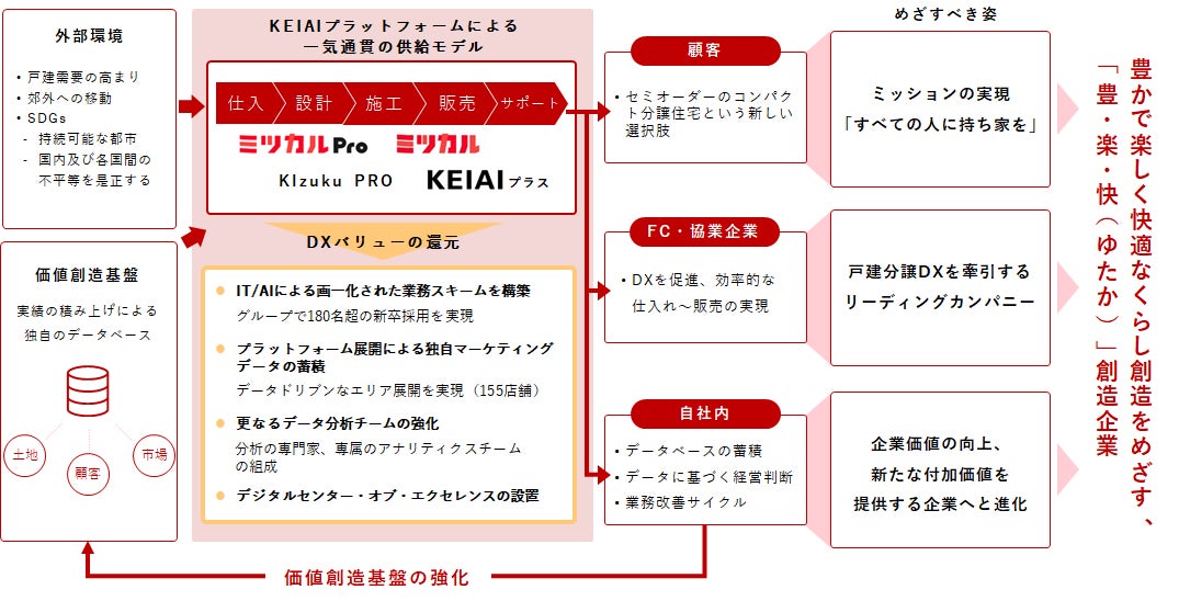 「豊かで楽しく快適なくらしの創造」を経営理念に、「すべての人に持ち家を」をミッションとし、『高品質だけど低価格なデザイン住宅』を提供しています。仕入れから販売までを一気通貫で行うリアル×テクノロジーの基盤である「KEIAIプラットフォーム」を構築。テクノロジーの積極的な導入とコンパクト戸建住宅による独自のビジネスモデルによって、国内分譲住宅市場シェアの拡大を図ります。今後も不動産業界のDXを牽引するリーディングカンパニーとして、価値ある分譲住宅を提供していきます。