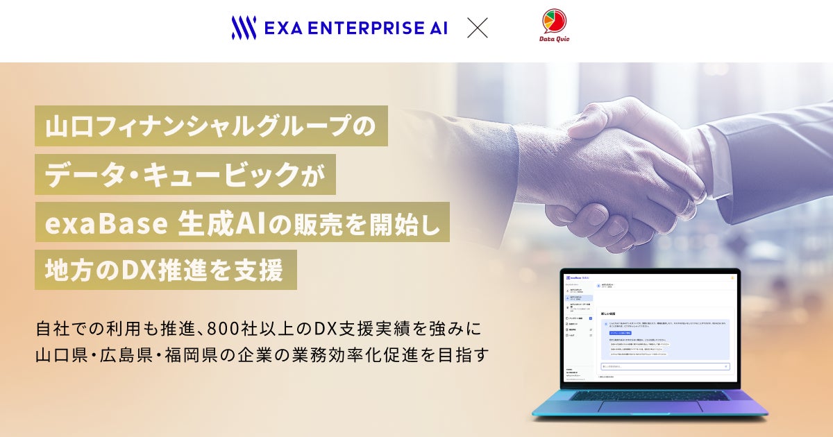 株式会社エクサウィザーズのグループ会社である株式会社Exa Enterprise AI(東京都港区、代表取締役:大植 択真、以下Exa Enterprise AI)は、株式会社データ・キュービック(山口県下関市、代表取締役:多賀本 悠介、以下データ・キュービック)と、国内市場シェア1位を獲得した*1法人向けChatGPTサービス「exaBase 生成AI」における販売業務委託契約を締結しました。山口フィナンシャルグループの子会社であるデータ・キュービックは、山口県・広島県・福岡県における800社以上の企業へのDX推進支援実績を強みとし、exaBase 生成AIの販売、導入サポートを推進することで、業務効率化の促進を目指してまいります。