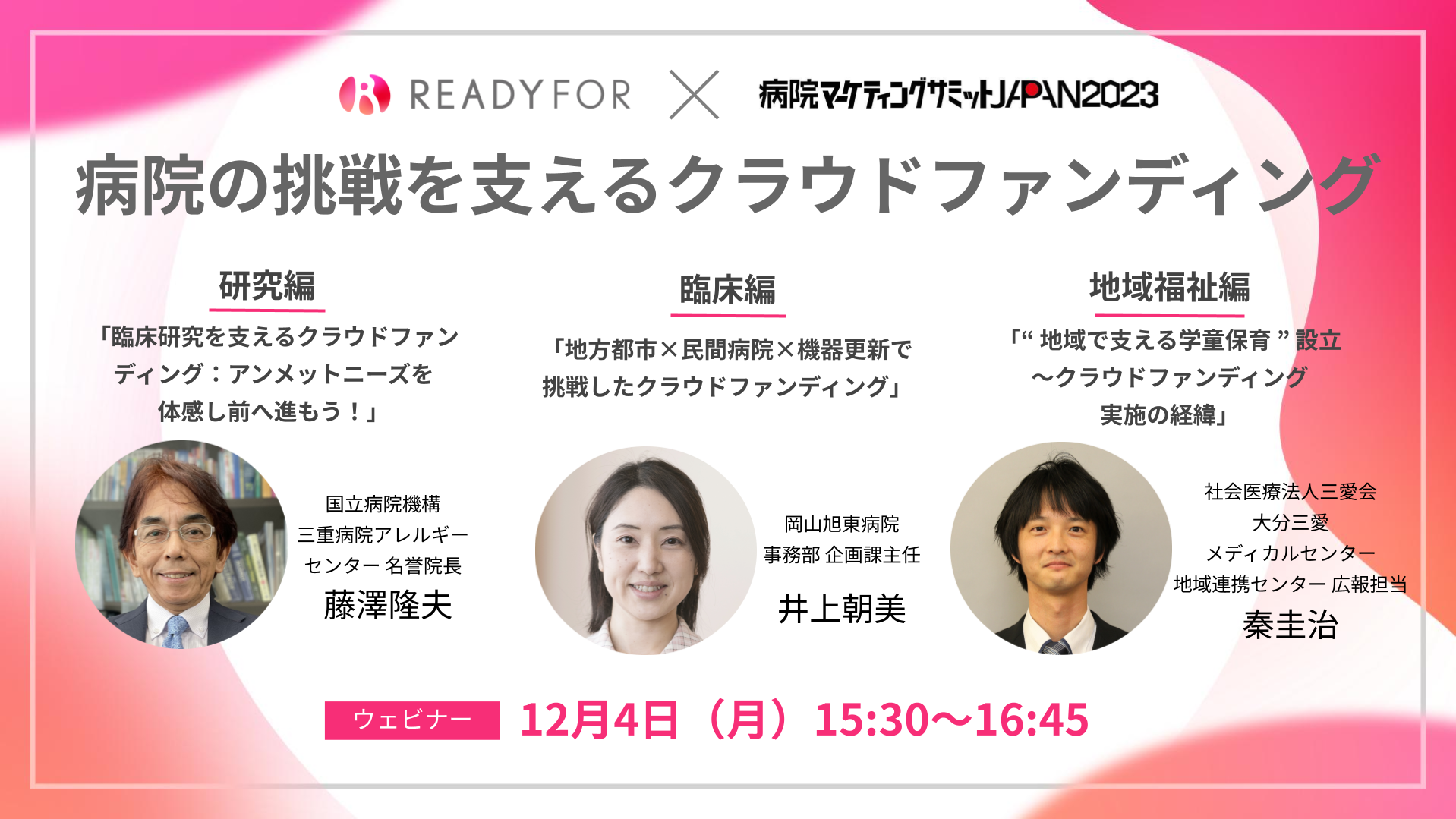 日本初・国内最大級のクラウドファンディングサービス「READYFOR」を運営するREADYFOR株式会社は、病院マーケティングサミットJAPAN2023と共催で、2023年12月4日(月)にウェビナー「病院の挑戦を支えるクラウドファンディング」を開催いたします。