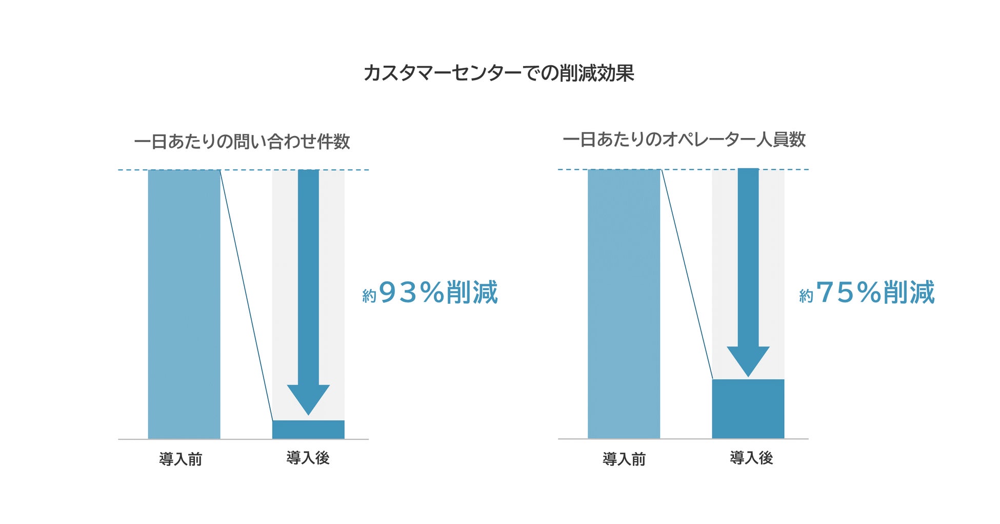 従来は1日最大数百件あった電話による問い合わせが、FAQ(よくある質問)の拡充と有人チャットへの切り替え・併用により問い合わせ件数は、約93%減まで削減されました。オペレーターも人員数を約4分の1となる約75%の省人化を実現しました。