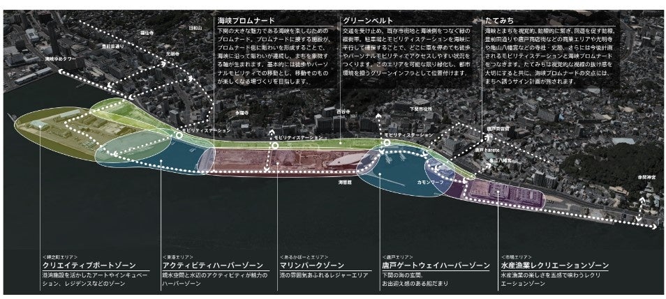 本プランでは、目指すべき方向性として、下関を中心に関門エリアが「日本を代表するウォーターフロントシティ」となることを掲げています。開発コンセプトは「海峡を遊びこなす、朝から夜までめぐって楽しい、現代日本の港まち」と設定しました。プランには、星野リゾートが提案した「1、海峡を遊びこなすこと」、「2、朝から夜までめぐって楽しめること」「3、港まちらしさにフォーカスすること」を含む内容が組み込まれています。最大の観光資源である関門海峡を眺めるだけでなく、イベントやアクティビティなどの場として多様な手段で遊びこなし、早朝の市場の活気や、海峡の夜景など、場所や時間により移り変わる魅力でエリアを回遊する楽しみをつくります。また、釣りやクルージングといった体験など、下関・関門の港まちらしい景観・文化を楽しみつくすことができるエリアを目指します。