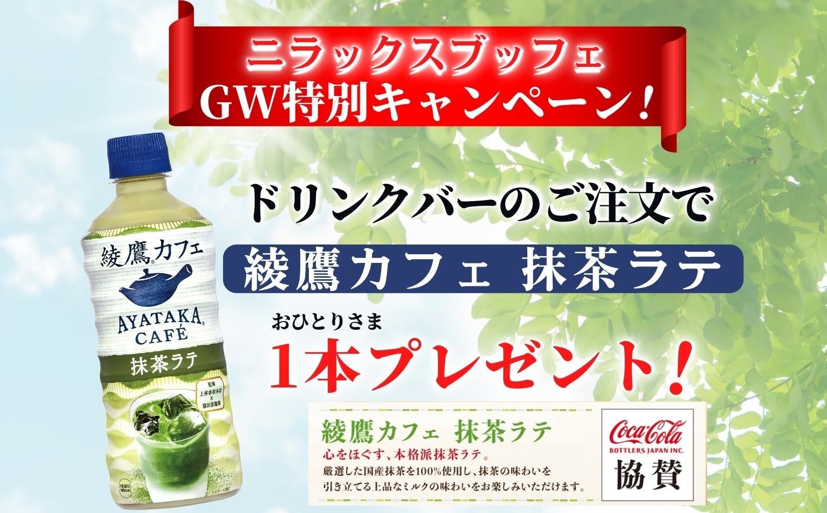 【ニラックスブッフェ】コカ・コーラ協賛GW特別企画!ドリンクバーのご利用で、大好評販売中の『綾鷹カフェ 抹茶ラテ』がもらえるプレゼントキャンペーン開催!!
