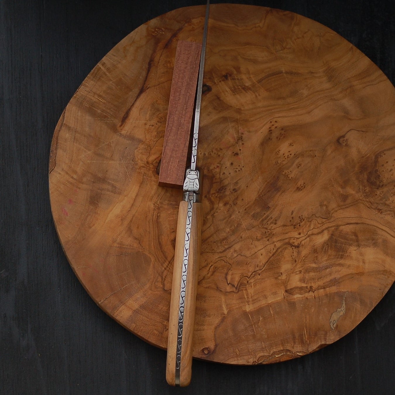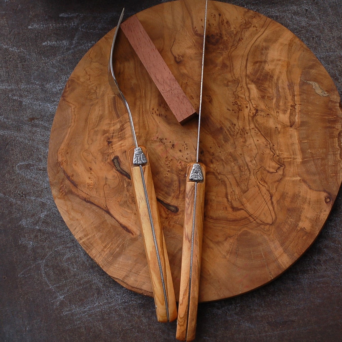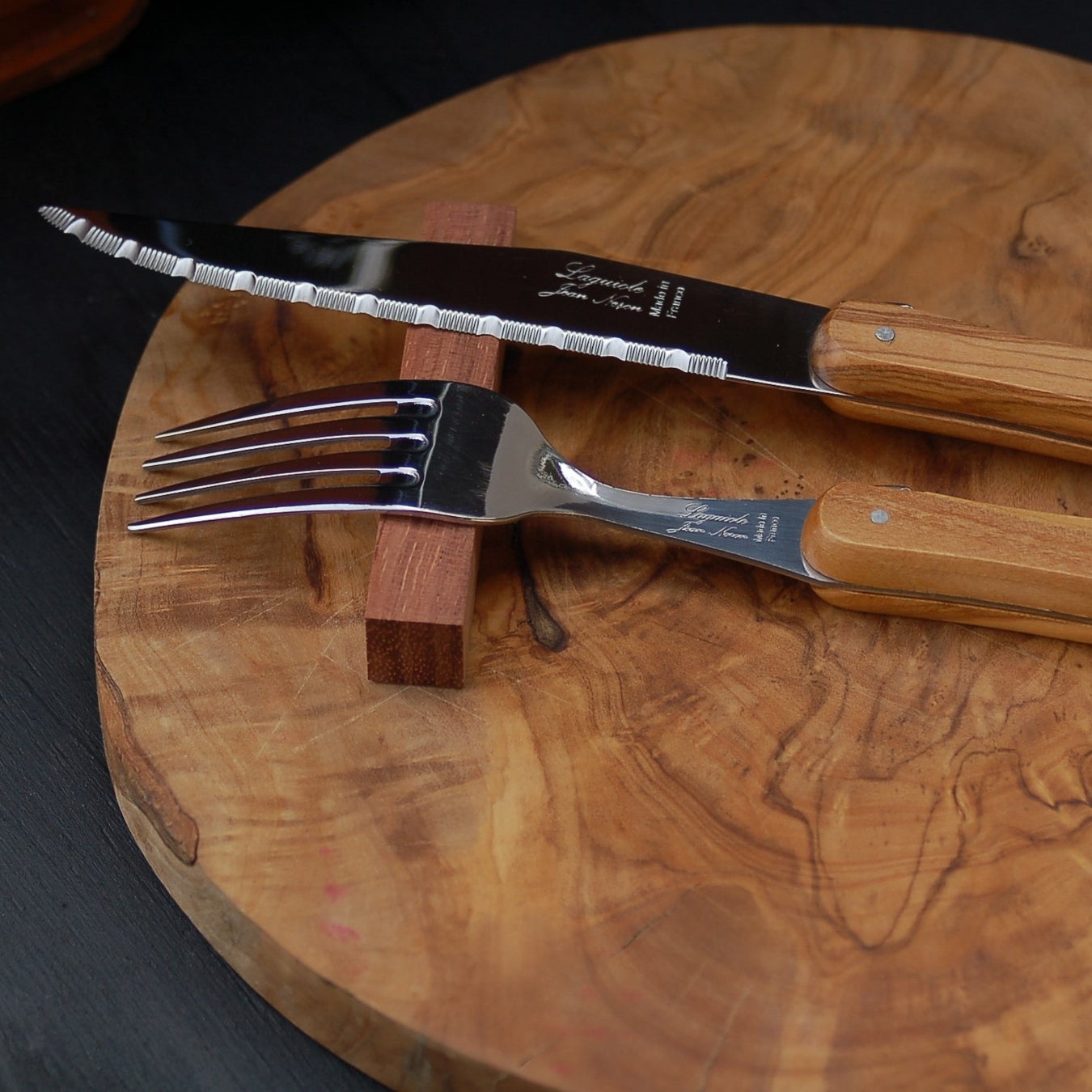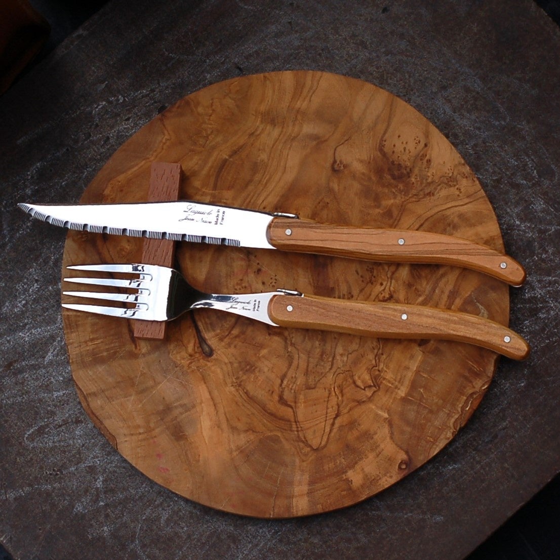 カトラリーのハンドルは天然オリーブ材です、木目や色合いは個体ごとに異なります