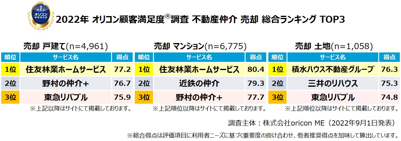 【住友林業ホームサービス】が『売却 戸建て』『売却 マンション』で総合1位、2年連続2冠に /(初調査)『売却 土地』は【積水ハウス不動産グループ】が総合1位