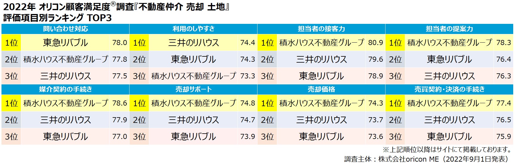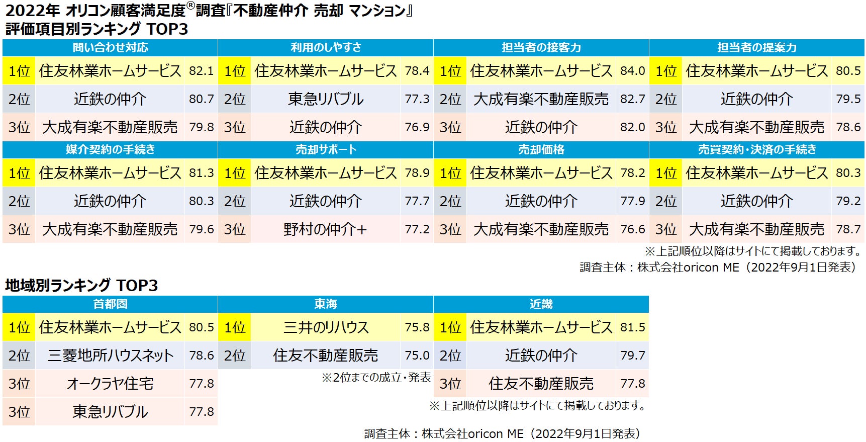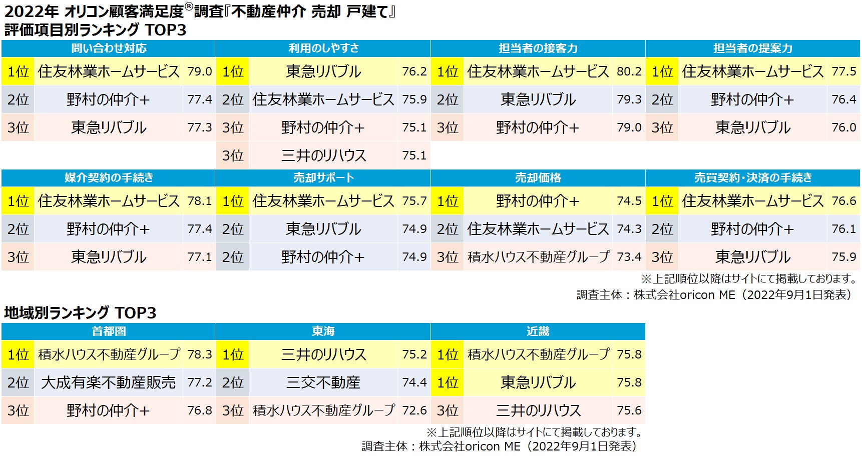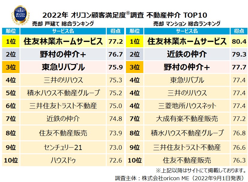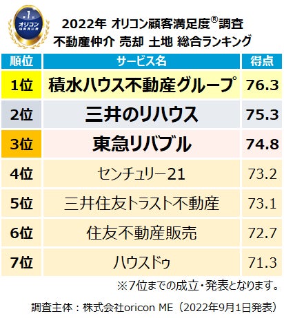 2022年最新『不動産仲介 売却(戸建て/マンション/土地)』ランキング(オリコン顧客満足度®調査)