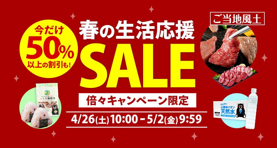 さらに、BEST SHOP AWARD 2024(※)で総合賞第9位やフルーツ果物カテゴリ大賞を受賞した「ご当地風土」において、昨今の物価高騰を受け、お客さまの家計を応援するため、お米や水、肉などグルメ商品が期間中50%以上の割引価格でお買い求めいただけるほか、おトクな割引クーポンを提供する「春の生活応援セール」を開催します。