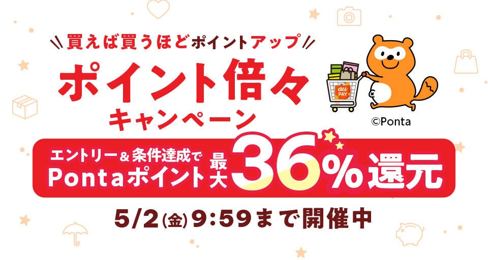 期間中に下記①~③をすべて満たすお客さま ①「au PAY マーケット」で会員登録、またはログインをいただくこと ②キャンペーンページからエントリーしてクーポンを取得いただくこと ③期間中、1商品につき商品単価1,000円(税込)以上の商品をご購入いただくこと ※ポイント上限は、2,000ポイントとなります。 ※還元ポイントは、Pontaポイント(au PAY マーケット限定)となります。 ※1商品目、2商品目、3商品目、4商品目、5商品目は、それぞれ異なる商品の購入が必要です。 |