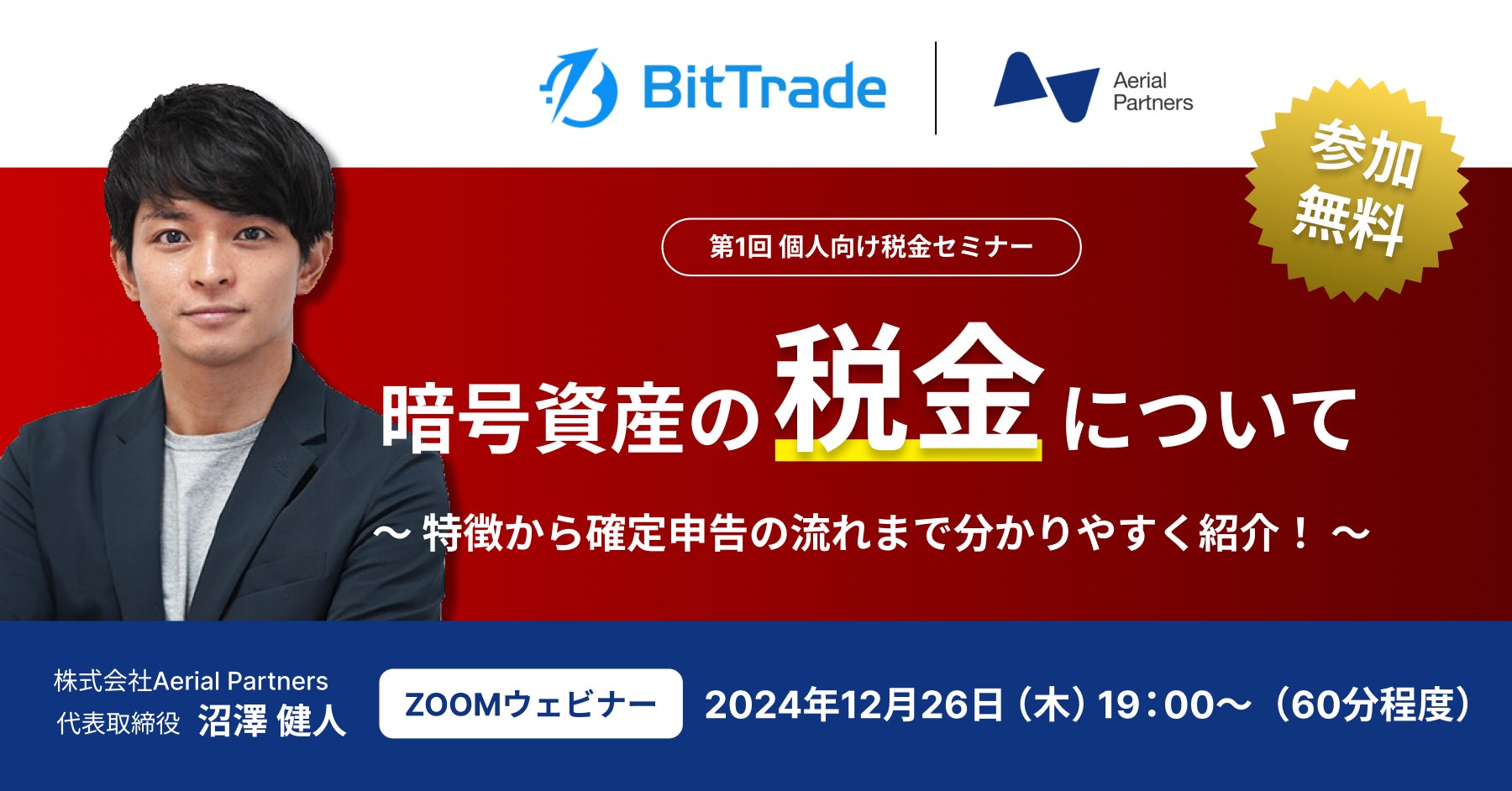 ビットトレード株式会社(本社:東京都港区、代表取締役社長:関 磊、以下「ビットトレード」)と株式会社Aerial Partners(本社:東京都港区、代表取締役社長:沼澤 健人、以下「Aerial Partners」)が2024年12月26日19時より、確定申告期に向けた「暗号資産の税金セミナー」の第1回を実施いたします。