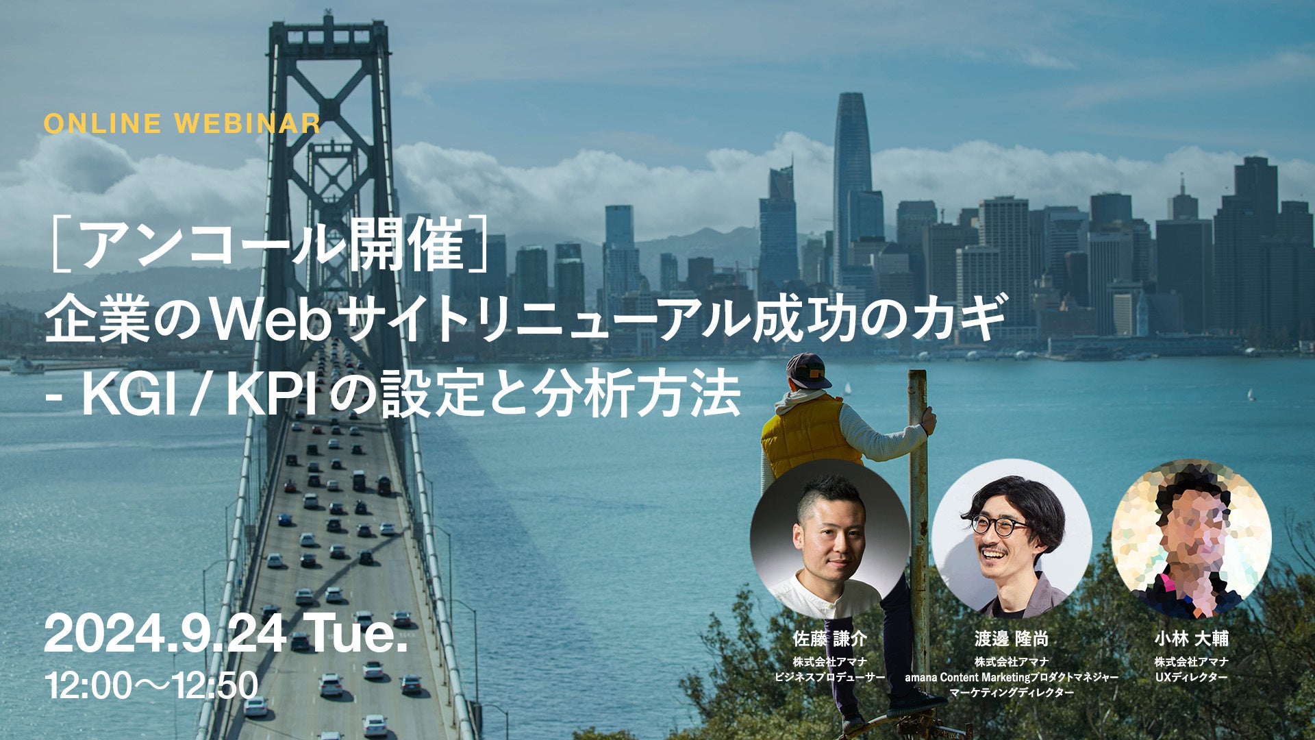 2024年9月24日(火)ウェビナー開催のお知らせ「[アンコール開催]企業のWebサイトリニューアル成功のカギ - KGI/KPIの設定と分析方法」