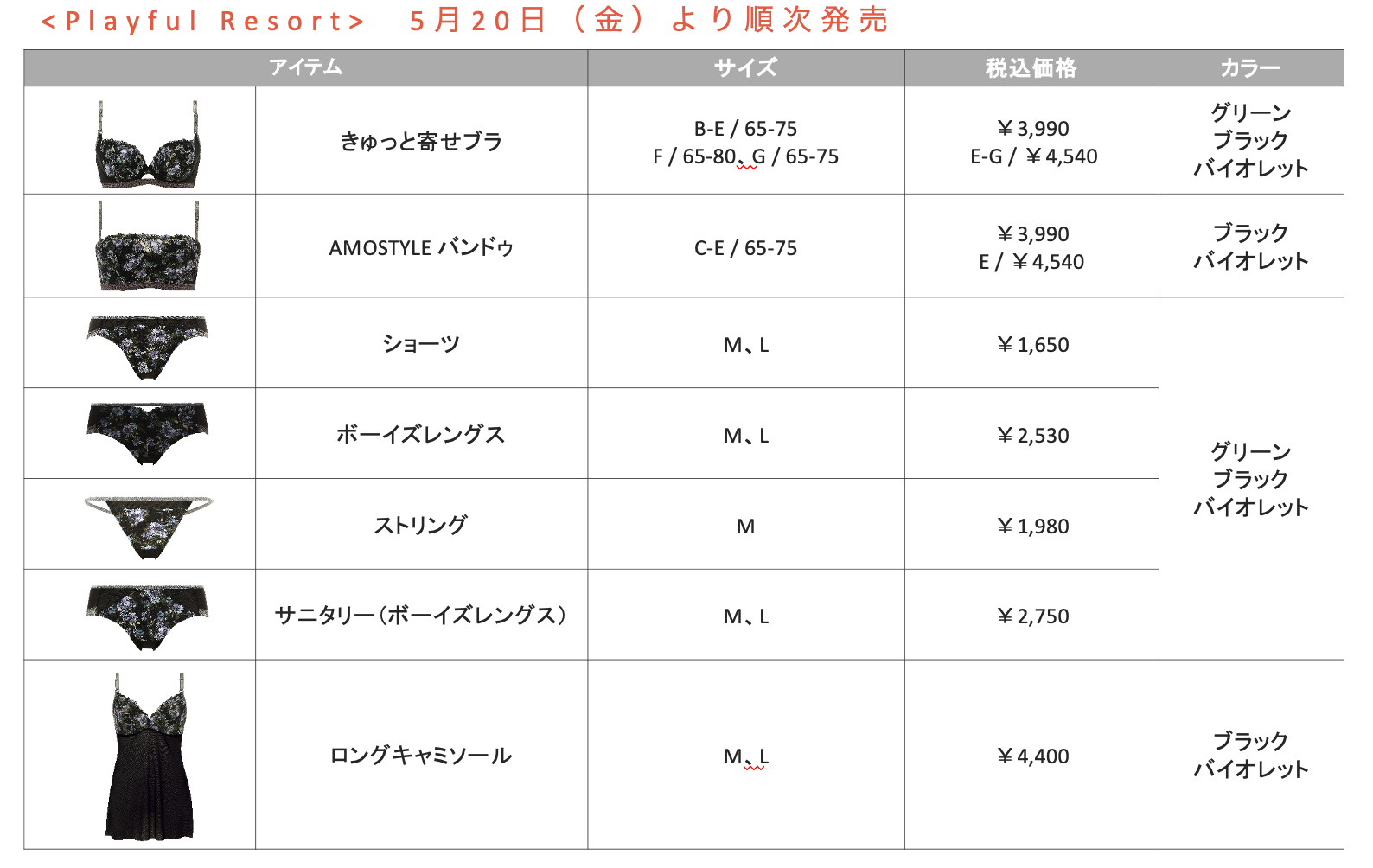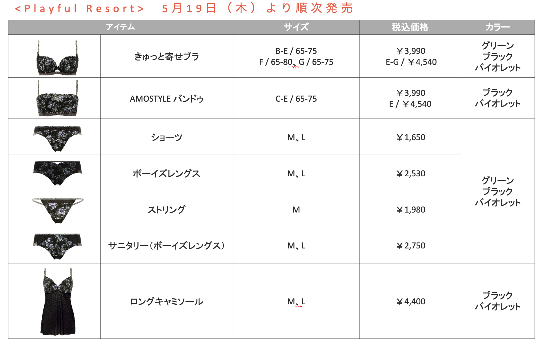 トリンプ・インターナショナル・ジャパン株式会社(本社:東京都中央区築地5-6-4、代表取締役社長:ヴァンサン・ネリアス)の直営店「AMOSTYLE BY Triumph(アモスタイル バイ トリンプ)以下 アモスタイル」から、これからの季節にぴったりのカラー&アイテムの<Playful resort(プレイフル リゾート)>を5月20日(金)よりアモスタイル店舗及びアモスタイル公式オンラインショップ(https://jp.amos-style.com/)にて順次発売します。