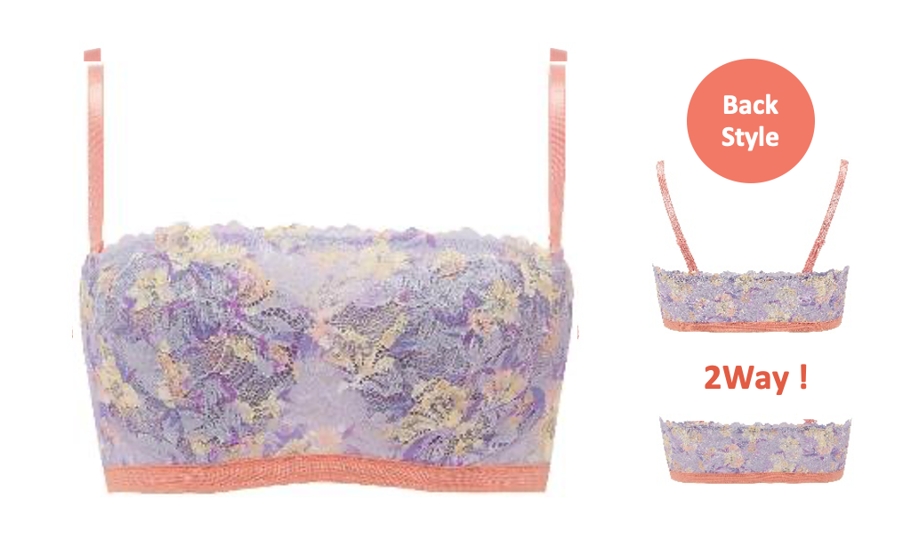 ストラップレスにもできて、夏に大活躍するバンドゥタイプが早くも登場!カップ全面にレースをあしらったデザインがポイント。フックは脇部分に設計し、背中部分もレース仕様で、チラ見せOKなタイプです。多重構造のファイバーフィル素材を使用したマシュマロクッションパッドが胸を自然にボリュームアップ。