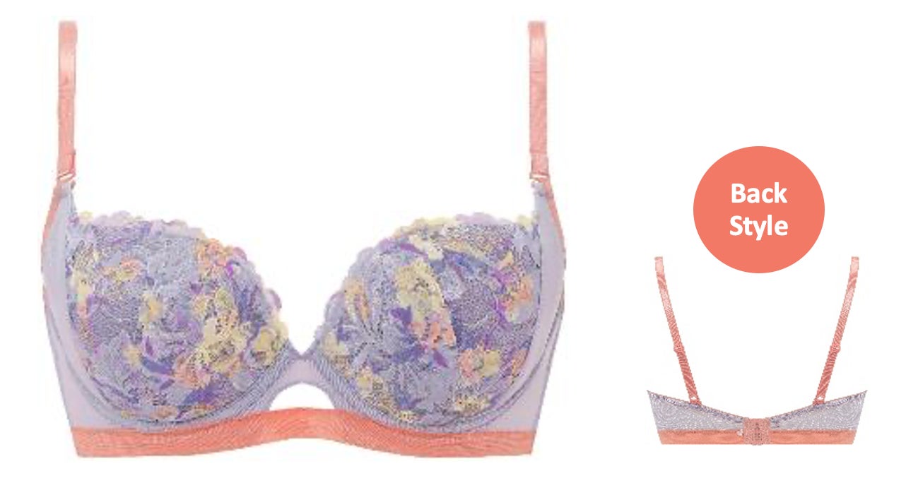 リーフモチーフの編みレースの上にハイビスカスのプリントを施した、華やかなレースがポイント。レースにのせた夏らしいソルベカラーがリゾート気分を盛り上げます。アンダーテープやストラップのカラーがアクセントに。ストラップレスでも着用できるバンドゥブラも展開します。