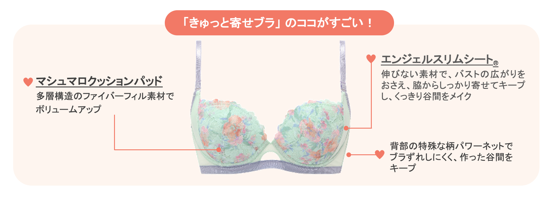 カップ脇の伸びないエンジェルスリムシート®で、脇からバストをしっかり引き寄せてキープし、マシュマロクッションパッドでボリュームアップ!くっきり美しい谷間をメイクします。