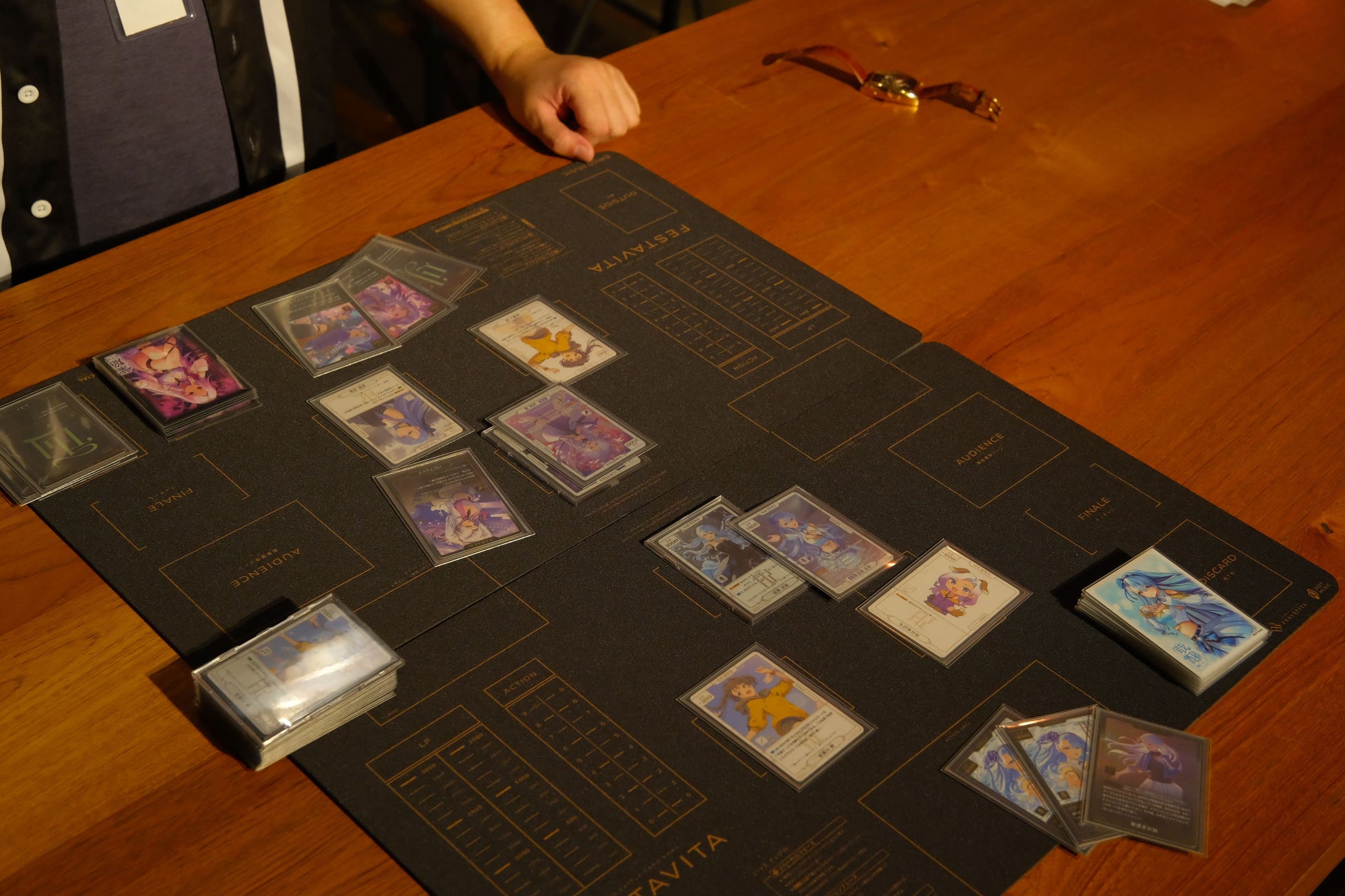 会場中央にはゲームプレイエリアが。「バーチャルシンガー」を題材とした完全新規のオリジナルトレーディングカードゲーム『フェスタヴィータ(FestaVita)』をスタッフから直接レクチャーを受けながら体験することができた。