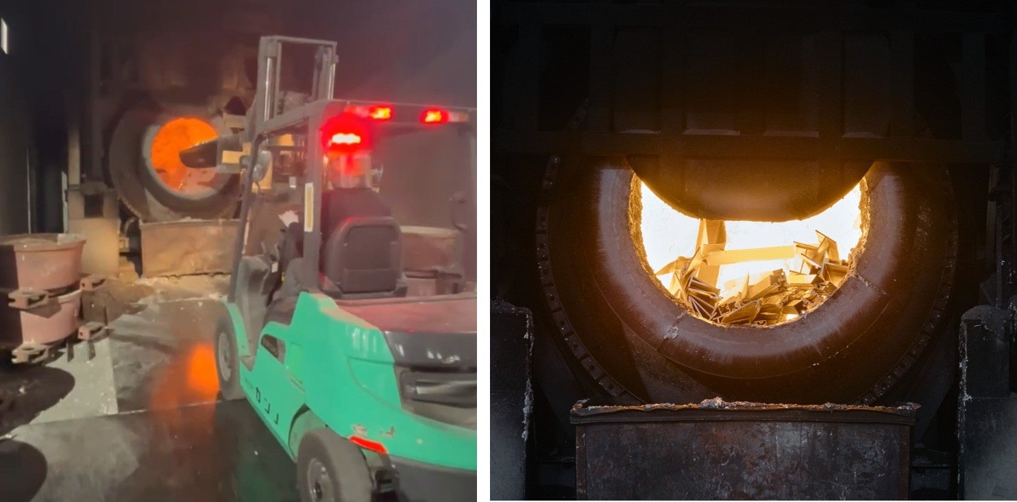 アルミニウムリサイクル工場では、用途に応じて複数のリサイクルアルミ品種を製造しています。メインとなるアルミ原料を投入し、高温で加熱する工程の中で、廃カラー剤アルミチューブも併せて投入されます。各種アルミ原料が溶解され、液体状の再生アルミニウムとなります。