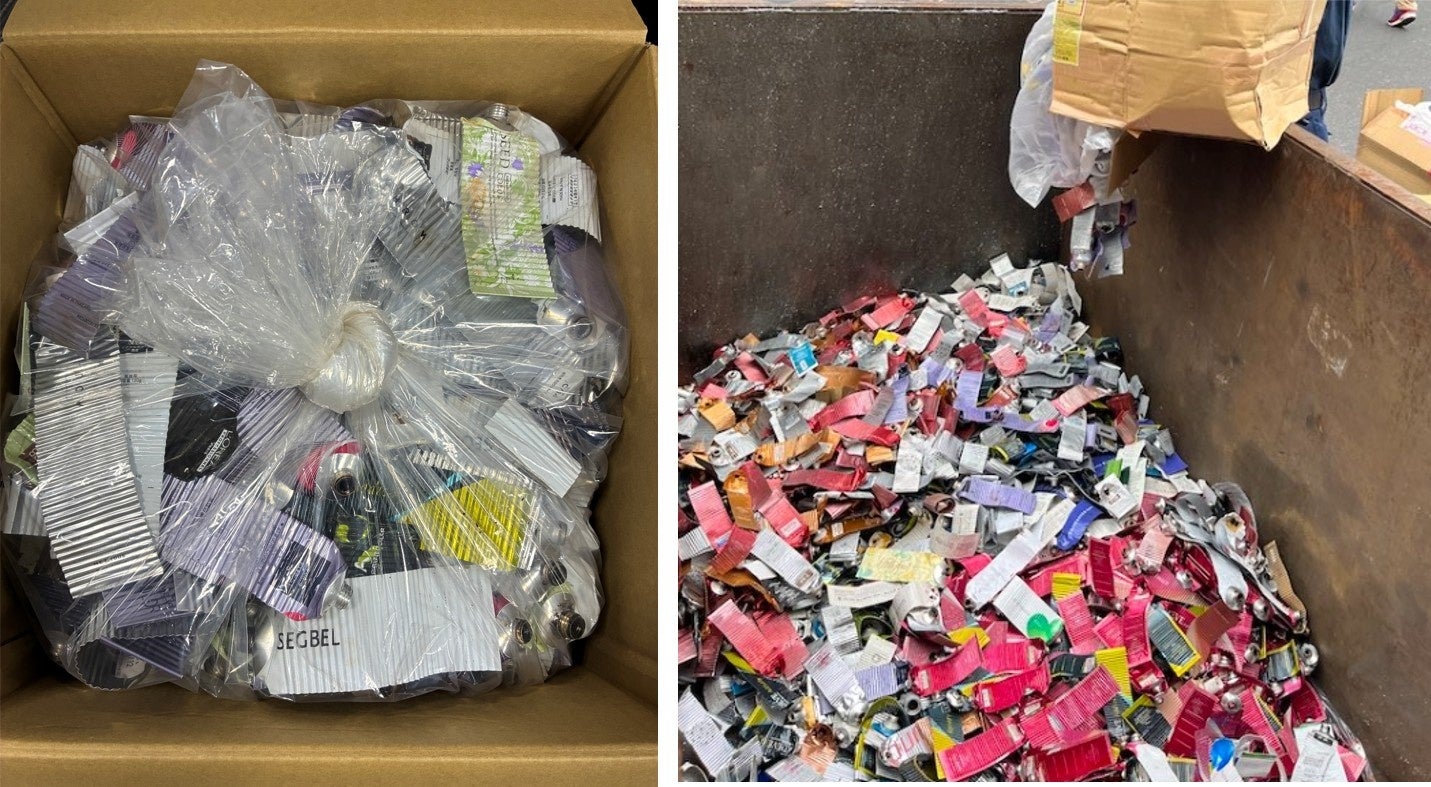 全国各地の理美容関係者から、使用済みの廃カラー剤アルミチューブが集約されます。チューブは、キャップの取り外しや内容物の絞り出しなどの簡易的な選別を行い、臭気対策および残渣の漏れ防止のためビニール袋で密封し、段ボールに梱包した状態で搬送されます。