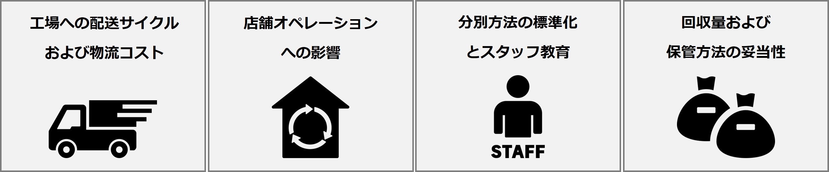 2025年3月よりモデル店舗6店舗で試験的に導入を行い、工場への配送サイクルや配送にかかる費用、スタッフ教育と分別方法の標準化などを検証しました。現時点では、配送料のコスト面や収益性においては課題がありますが、「リサイクル活動を実現し、環境配慮を最優先」に取り組みを進めています。