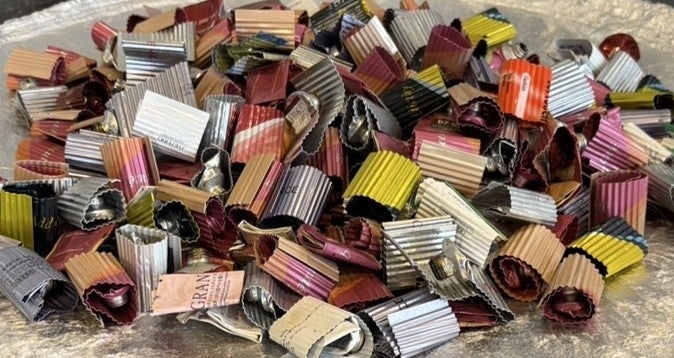 廃カラー剤アルミチューブは、純度の高いアルミニウムでできています。一方で、1本あたりの重量が非常に軽量であるため、単体で使用すると酸化しやすい特性があります。そのため、他のアルミニウム原材料と組み合わせることで、溶解工程に適した状態へと整えます。これにより、再資源化に向けた仕込み工程が完了します。