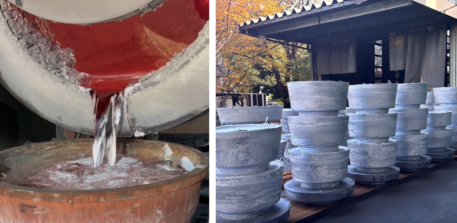 溶解されたアルミニウムが液体状になった状態を「お湯になる」と表現し、この状態のアルミニウムを鋳型に流し込み、凝固させる工程を「出湯・鋳造」と呼びます。この工程を経て、再生アルミニウム地金が形成されます。