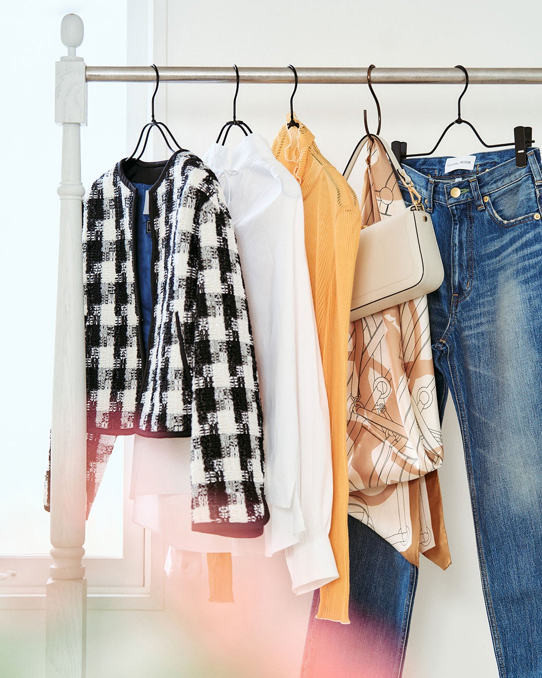 クラシックさの中にも新しさを感じる街並み。オーセンティックなギンガムチェックのところどころに散りばめられた透明糸や白黒のコントラストで都会的な印象に。