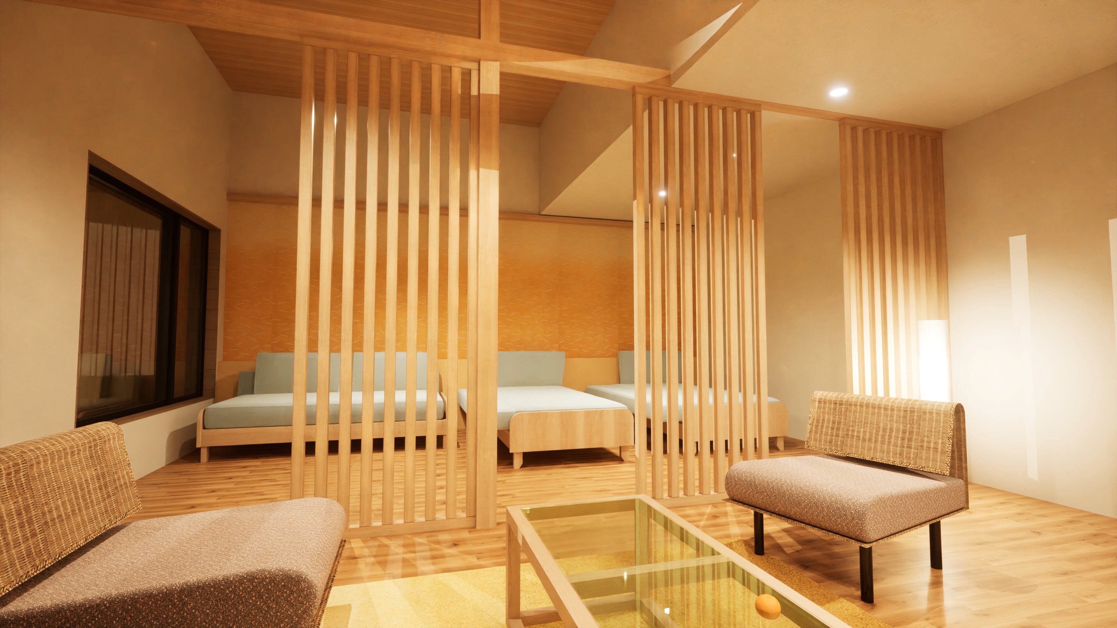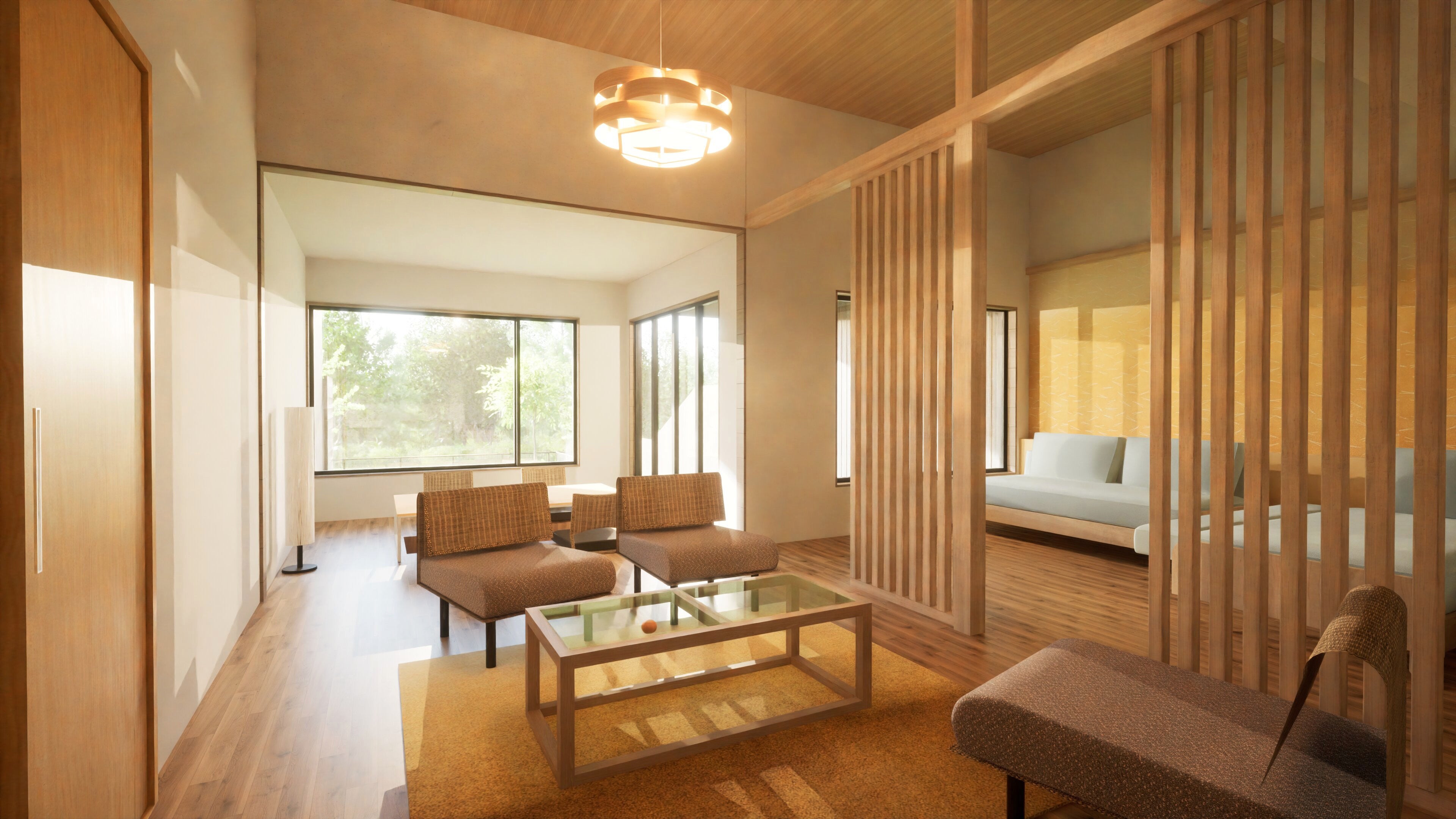 室内面積66㎡~115㎡、プライベートドッグラン面積140㎡~330㎡を設置した広い作りで、和モダンをコンセプトとした洗練されたデザインのお部屋となります。