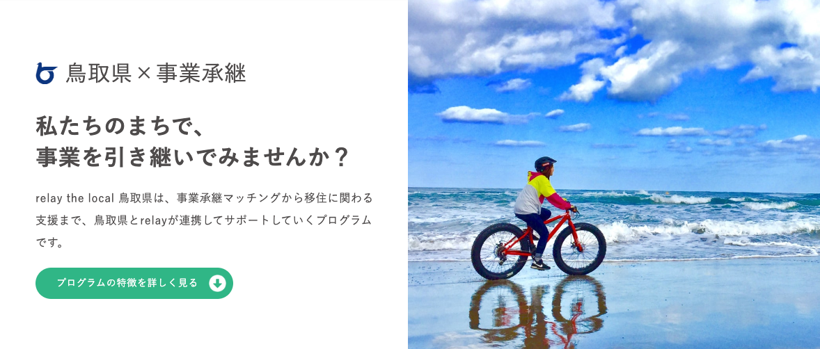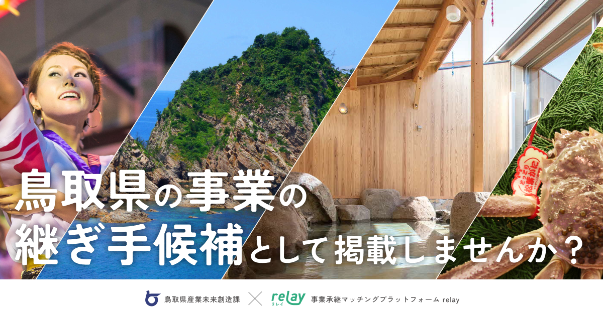 オープンネーム事業承継のパイオニアとして、事業を譲りたい事業者(売り手)の想いをオープンに掲載してきたrelayはこのたび、鳥取県との新しい取り組みとして、鳥取県内で事業を引き継ぎたい「とっとり後継ぎリノベーター」の熱い想いやストーリーを記事化し、鳥取県の後継者募集に特化した特設ページ「relay the local 鳥取県」内に掲載いたします。