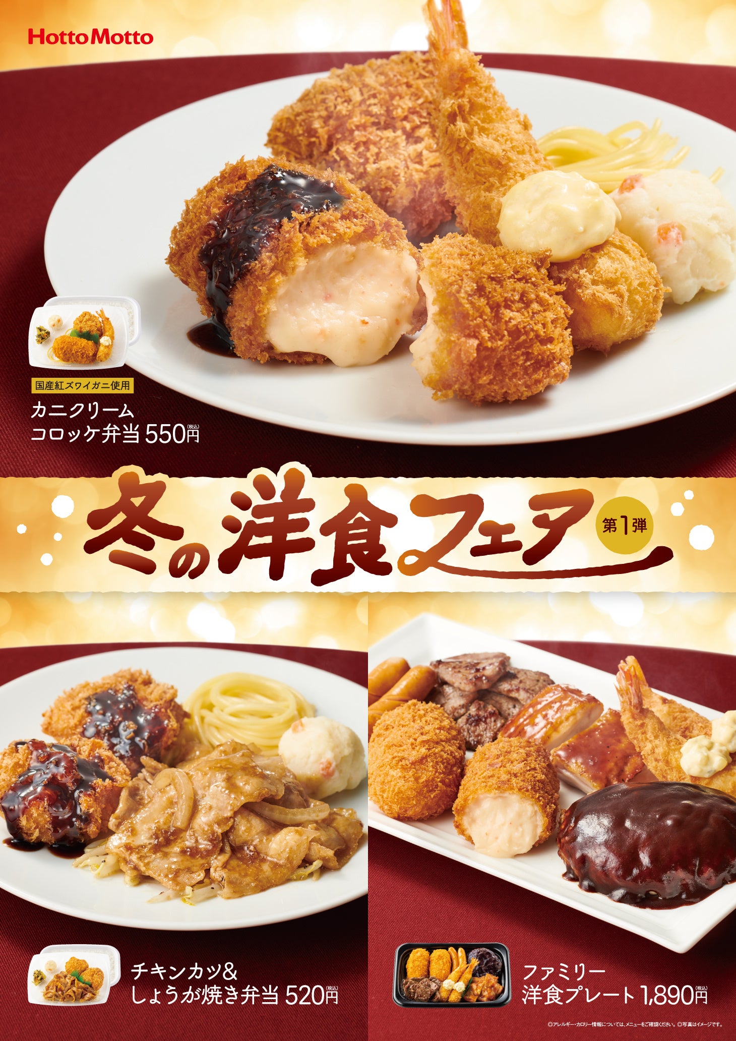 株式会社プレナスは、持ち帰り弁当の「Hotto Motto (ほっともっと)」を、2022年10月末現在、2,469店舗展開しております。このたび「ほっともっと」では、冬の洋食フェア第1弾として、昨年も好評いただいた、『カニクリームコロッケ弁当』550円と、『チキンカツ&しょうが焼き弁当』520円を、12月1日(木)より発売いたします。さらに、人気の洋食メニューを詰め込んだ『ファミリー洋食プレート』1,890円が新登場。カニクリームコロッケを中心に、カットステーキやハンバーグなど、大人から子供まで楽しめる洋食メニューが入ったプレートで、普段のおかずだけでなくホームパーティーにもぴったりです。