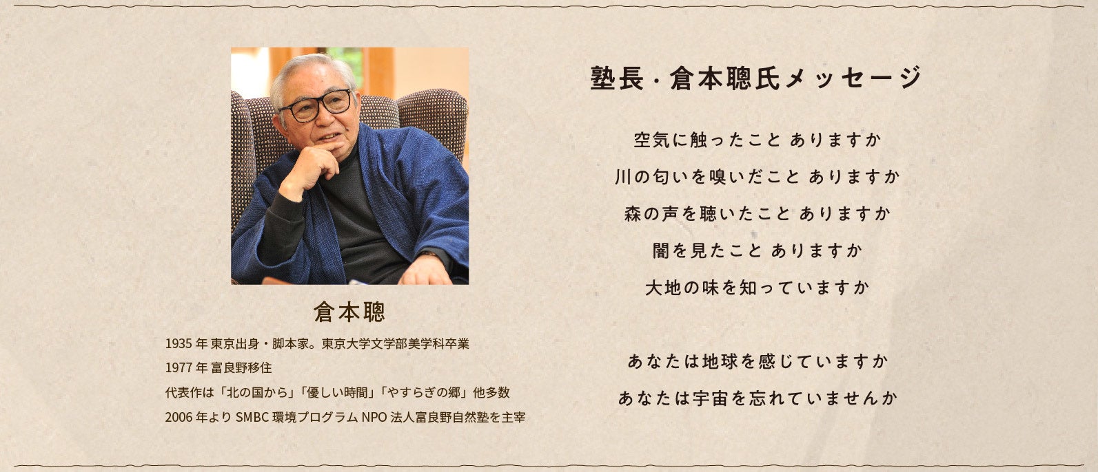 勝山自然塾のモデルである「富良野自然塾」は脚本家倉本聰氏が主宰し、北海道富良野市の閉鎖されたゴルフ場を元の森に還す「自然返還事業」と、演劇的手法を用いたドラマチックな表現や仕掛けによるプログラムで地球環境を楽しく学ぶことができる「環境教育事業」の場として生まれました。