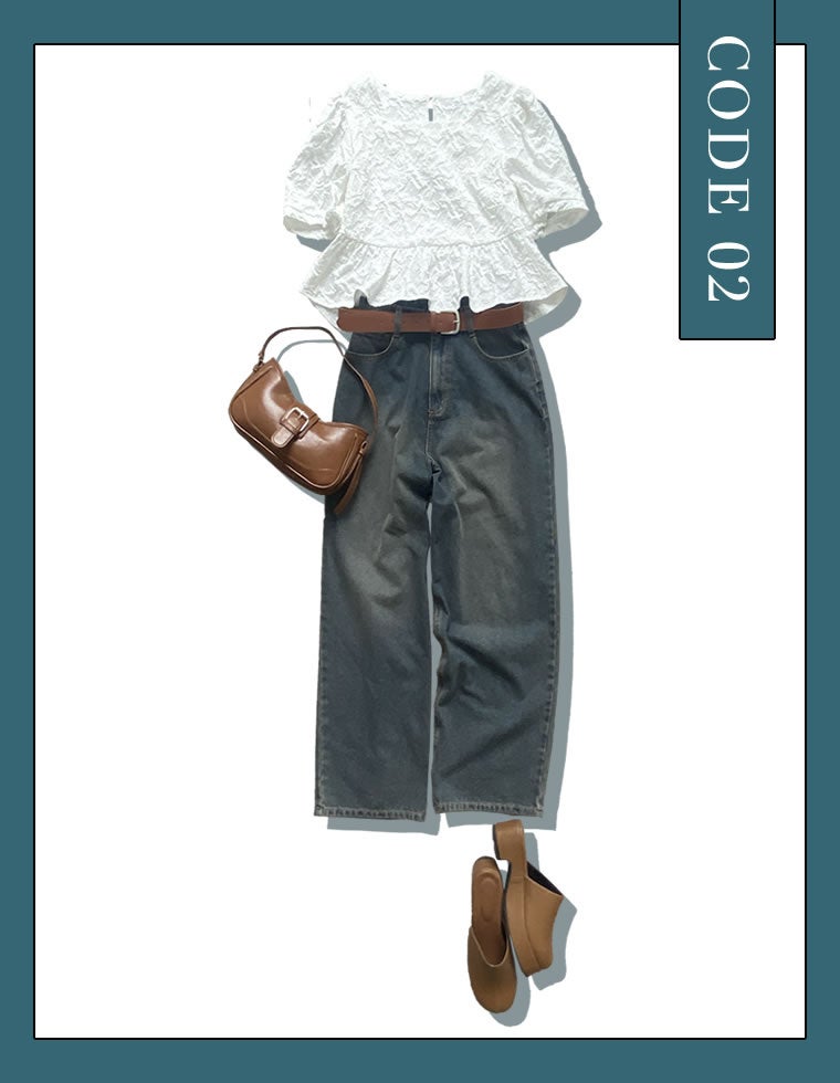カジュアルな印象になってしまいがちなデニムコーデも、 ジャガード独特の光沢がエレガントなペプラムトップスを合わせることで、バランスのとれたコーディネートが完成。