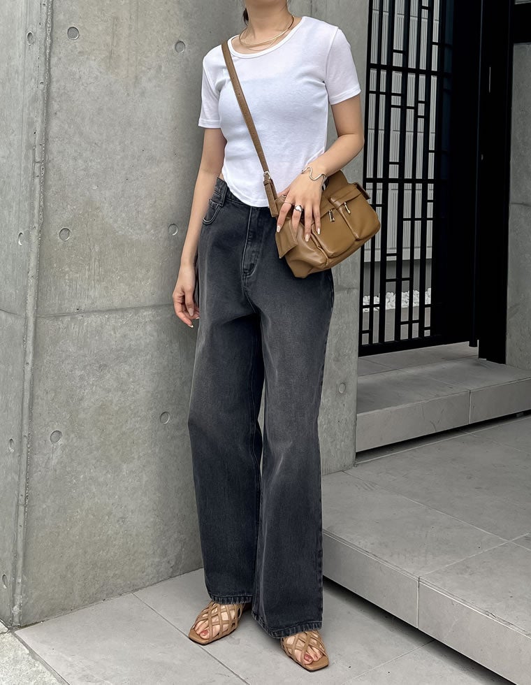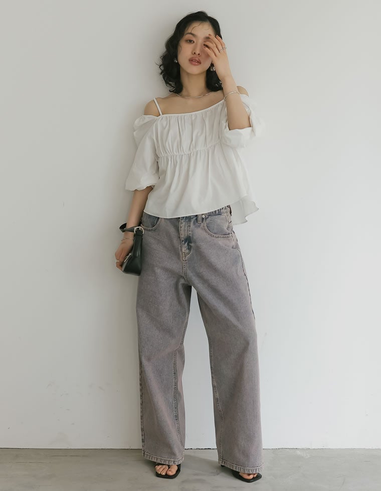 ウエスト周りがキュッとなるようなコンパクトなトップスと、ゆるっと感が旬のカーブデニムで脚を長く見せるバランスも意識。