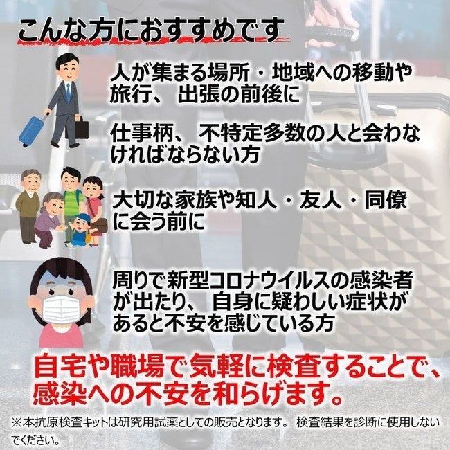 オミクロン株の増加に伴い、今回新しいタイプになった「抗原検査キット」のほうを販売開始致しますので、万が一の場合に備えて各団体、企業様のサポートになればと思っております。
