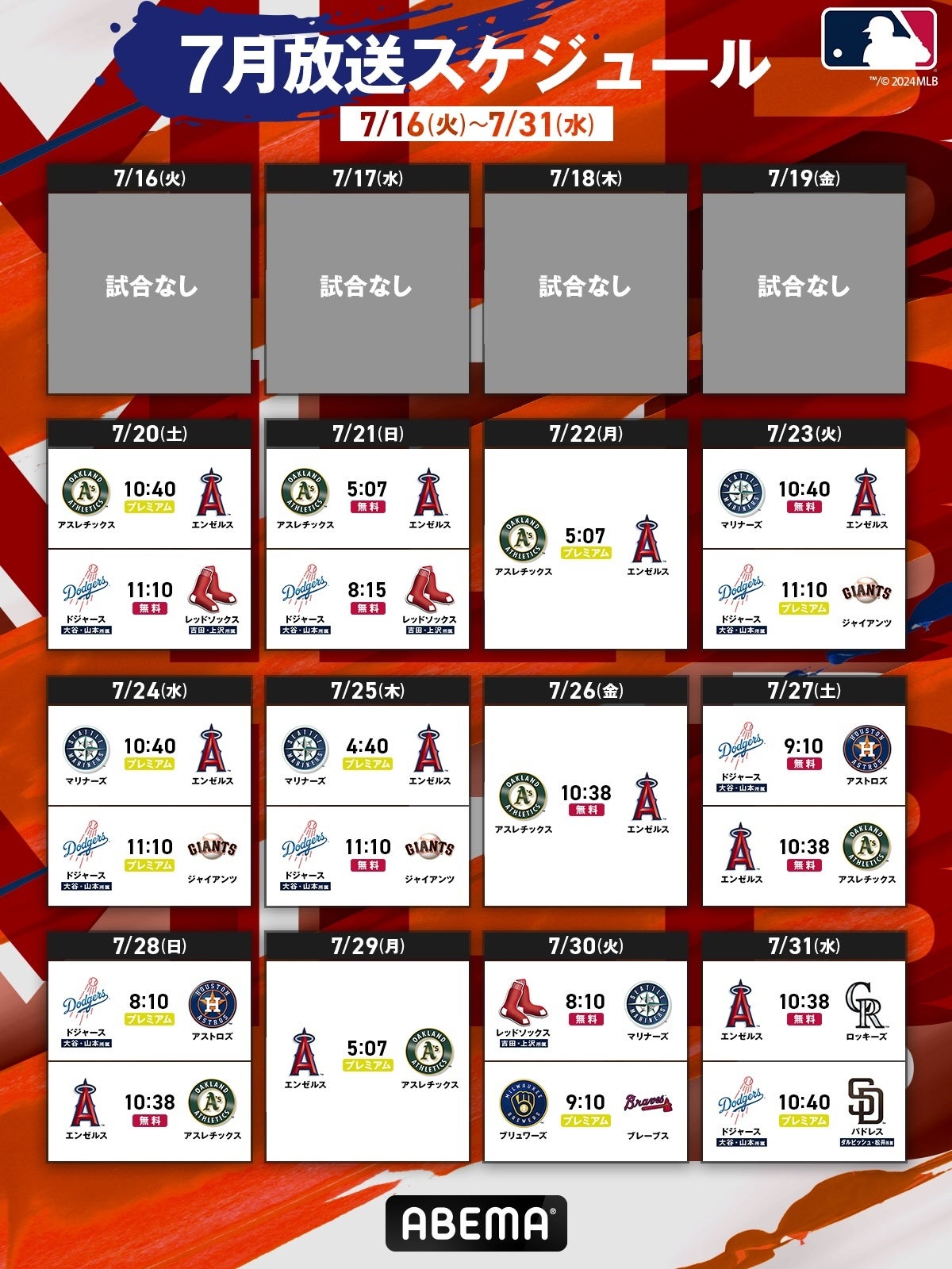 新しい未来のテレビ「ABEMA(アベマ)」は、MLB(メジャーリーグベースボール) 2024年シーズンにおいて、生中継する7月後半の試合スケジュールを公開いたしました。