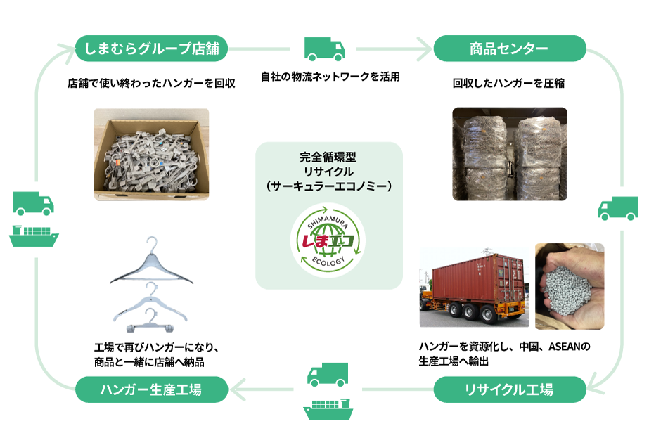 店舗で回収したハンガーを再生し、再び店舗で使用する「完全循環型リサイクル」を実施しています。